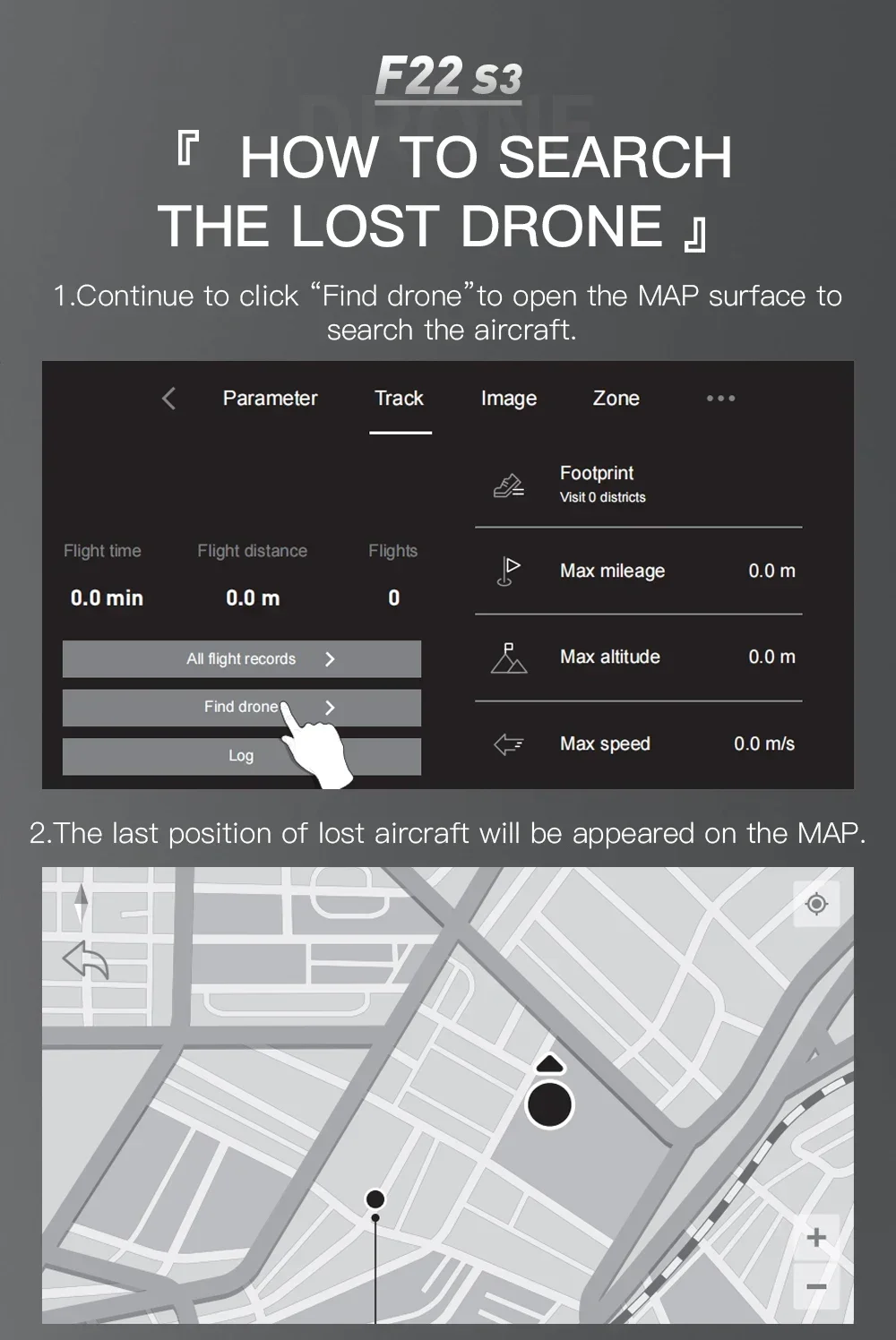 Open the app ->Settings ->Trajectory ->Find the aircraft, enter the map interface, and the map displays the last distance and latitude and longitude position of the aircraft.
