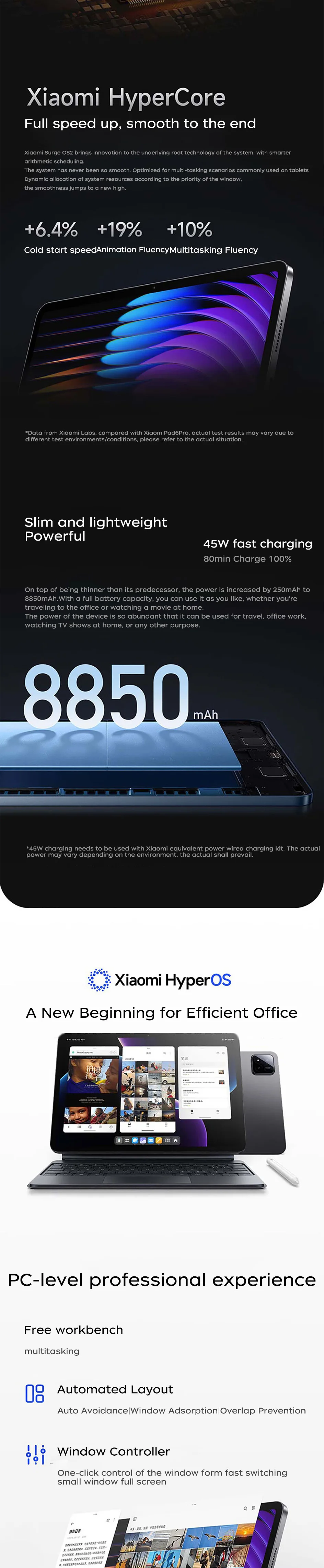 8850mAh(typ);Lithium-ion polymer battery, non-removable;USB Type-C double-sided charging interface;45W Fast charger, support PD QC charging protocol |