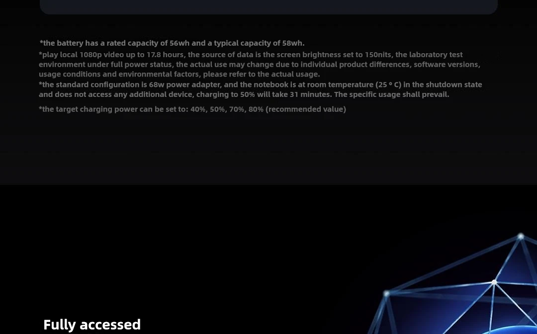 Fast Charging: Paired with a 68W all-in-one adapter, the laptop can be turned off at room temperature (25 ° C) without any additional devices connected, charging to 50% in 31 minutes