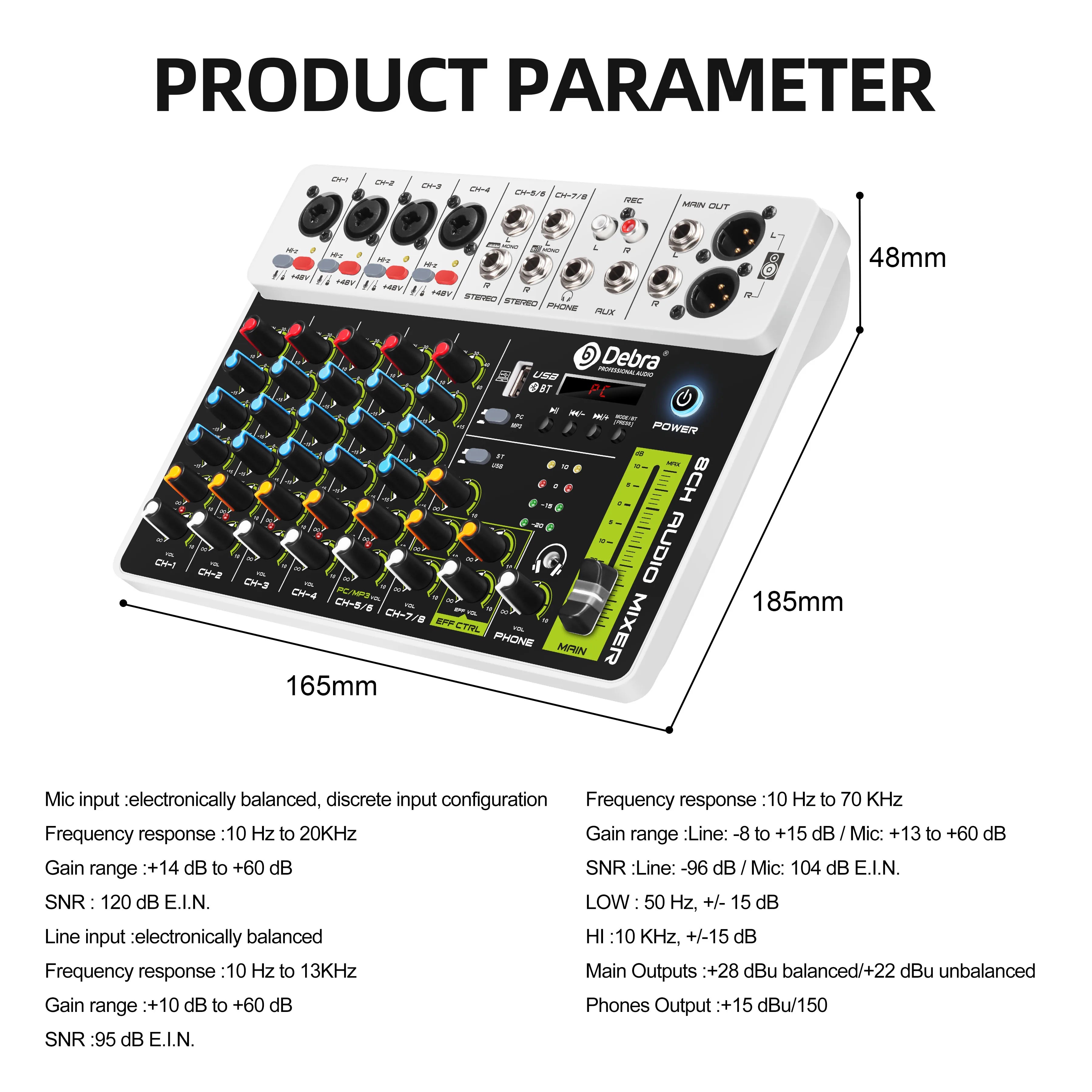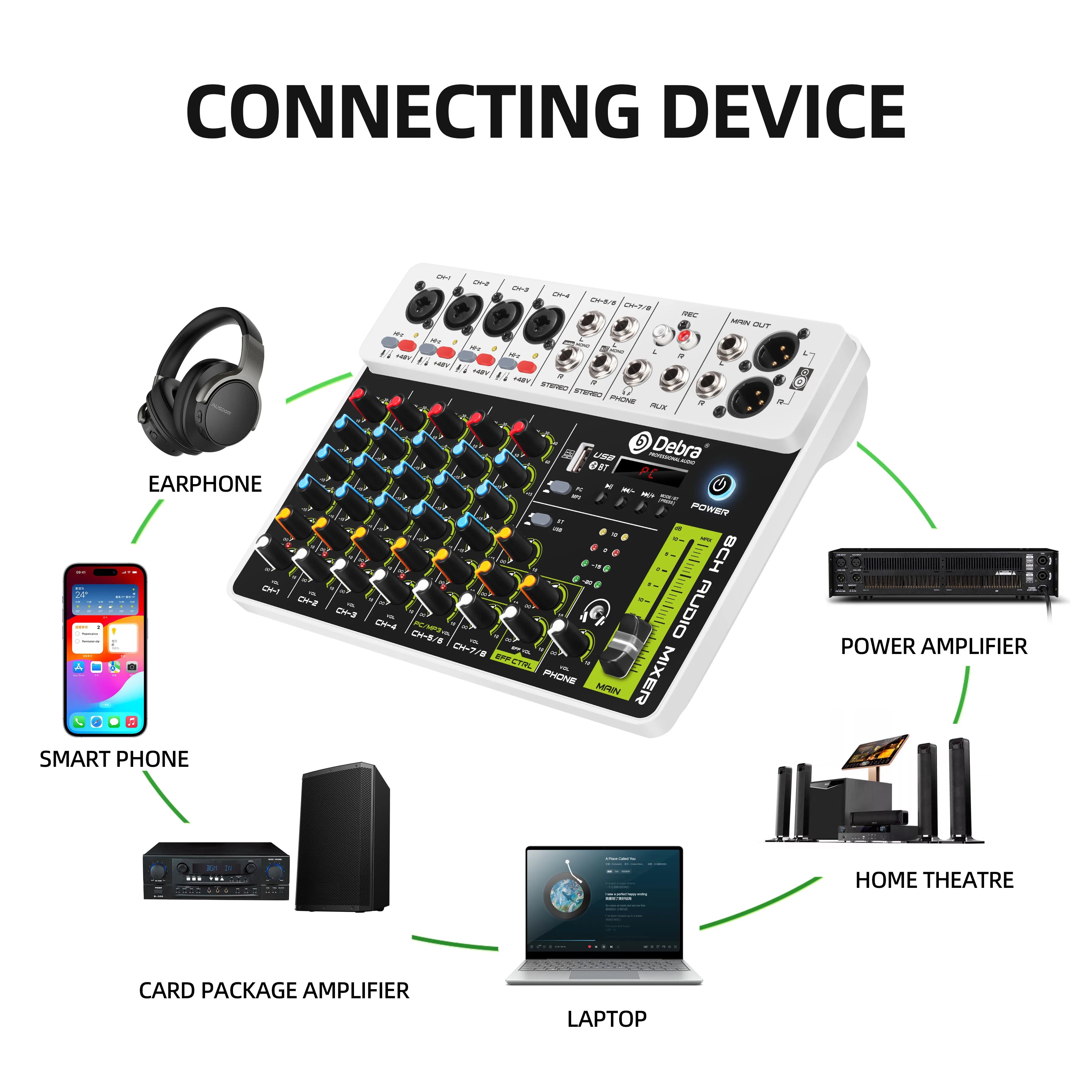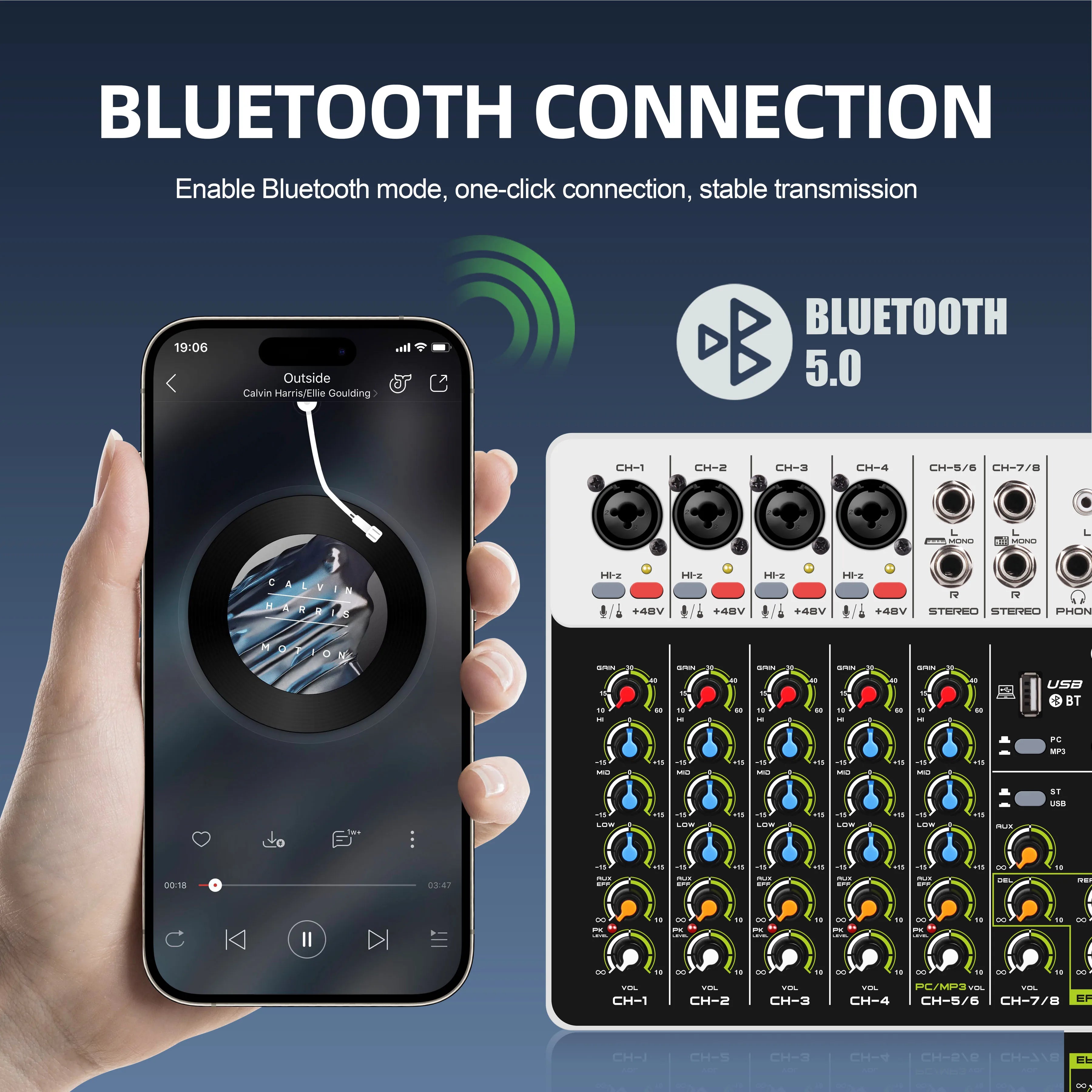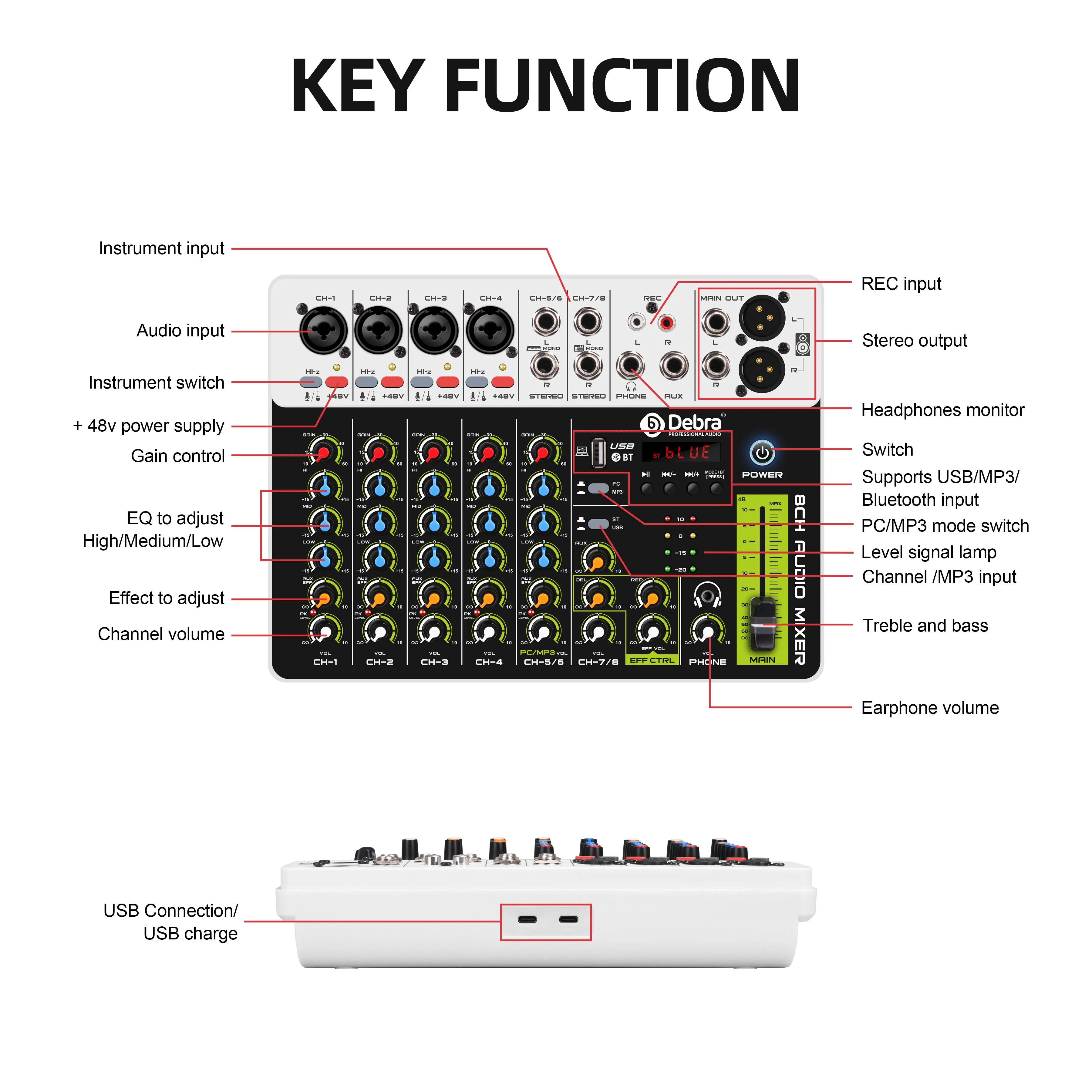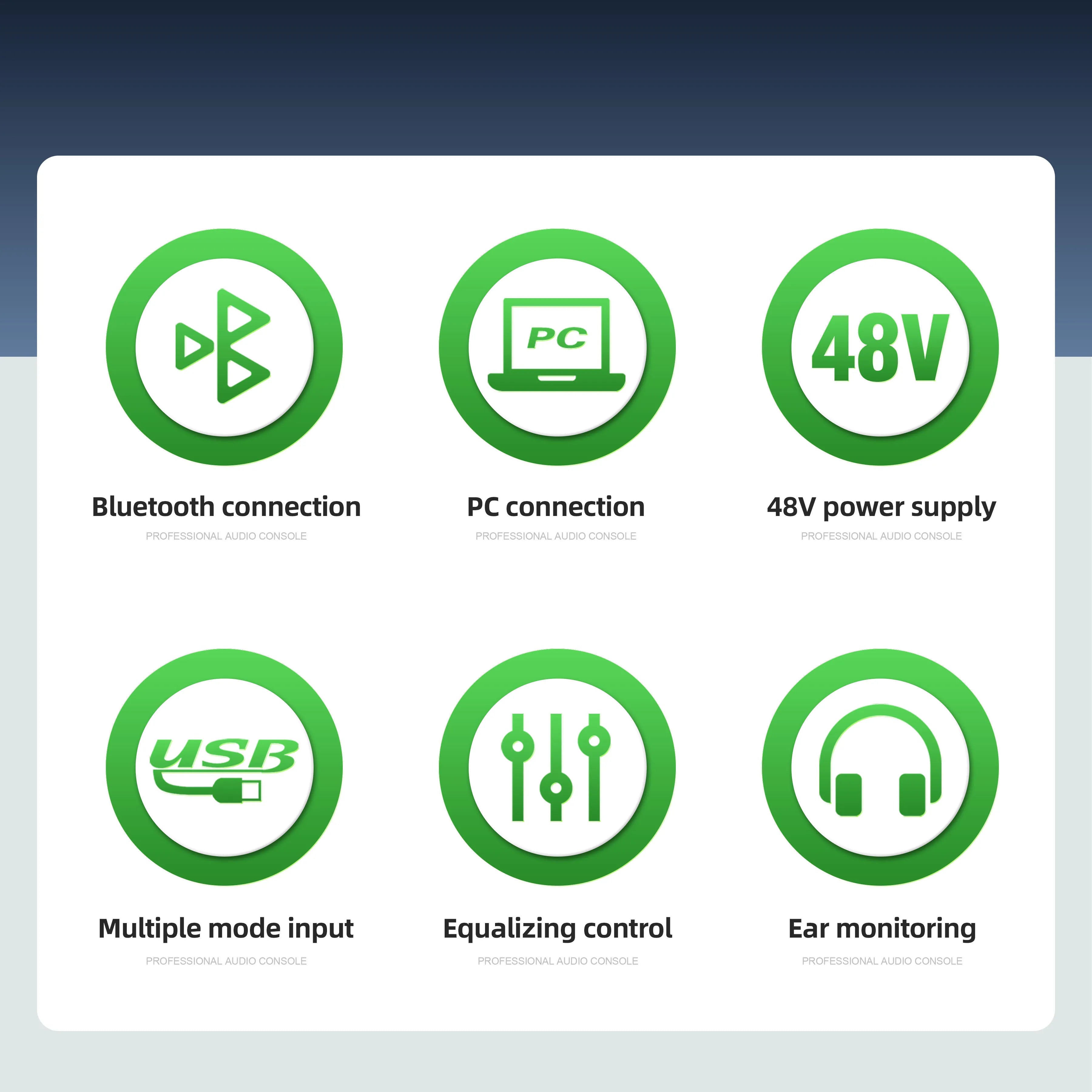 Product characteristics:The mixer is equipped、Input Gain and High Bass Adjustment、Built-in 48V Phantom power supply is suitable for direct power supply of condenser microphone、High Definition Headset Output Port、MP3 Player、Bluetooth reception、With connection PC Sound card。The mixer is small in size.、Lightweight,Can be directly connected PC The USB Port power supply,No additional power supply required,Can be through USB Connect the computer to supply power to run,The trouble of using an external adapter is saved.,You can also use mobile power or USB AC/DCThe adapter powers it.