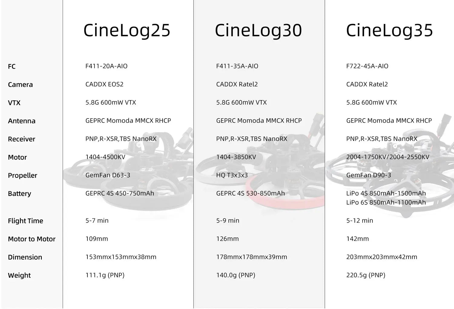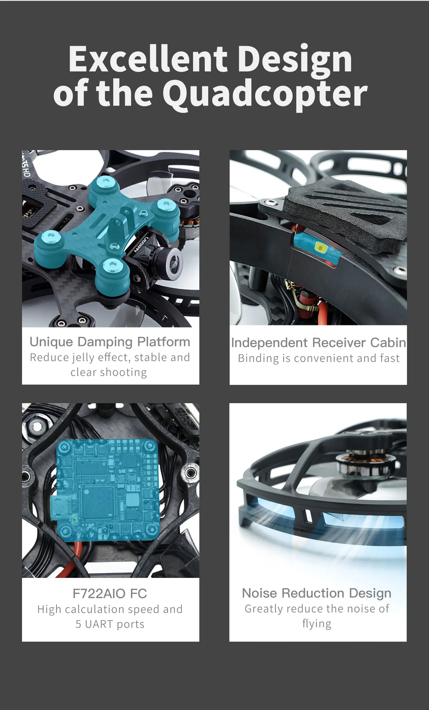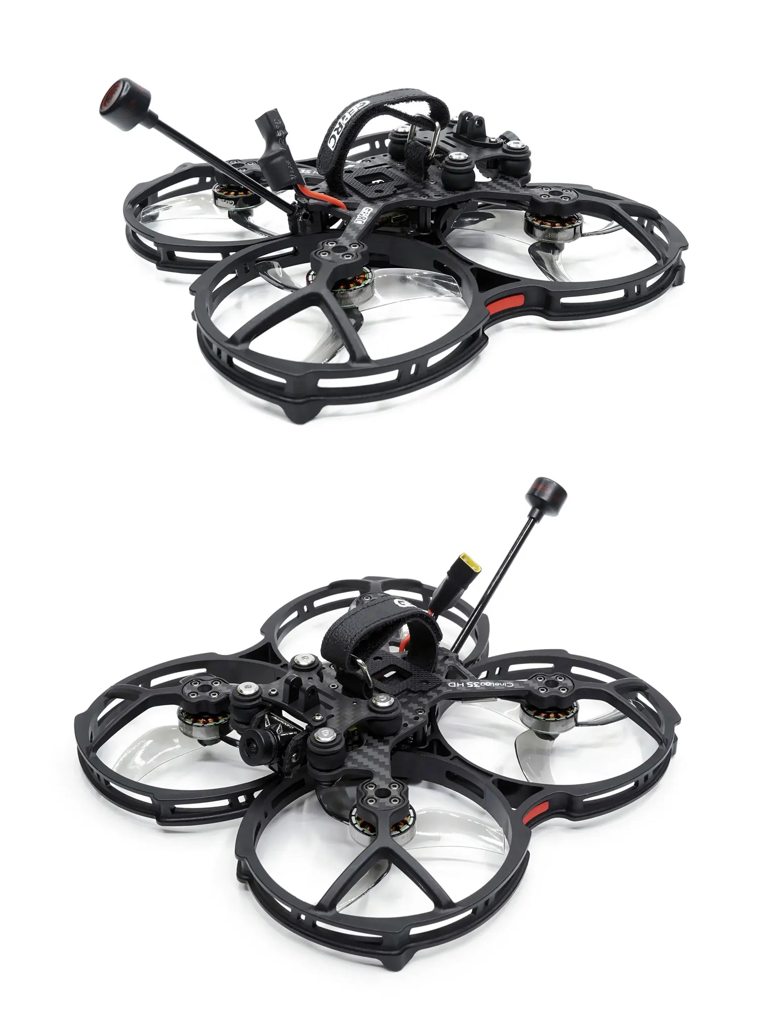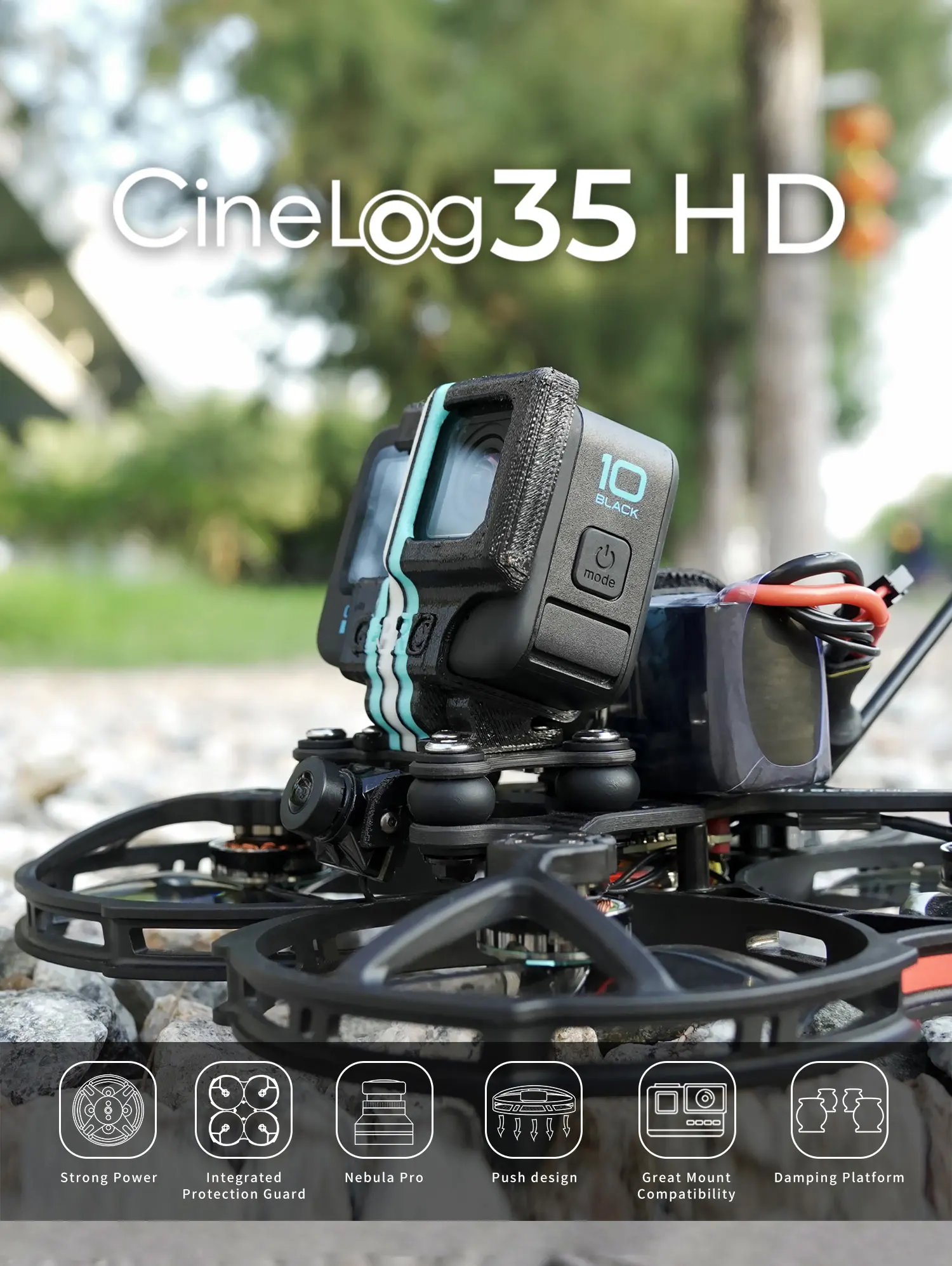 CineLog35 equips with VISTA HD VTX and the Nebula Pro camera, and the picture quality is extreme clear and clean. Upgraded power system, 2004 motor with D90-3 propeller has stronger power output. It comes with a 3D Print mount to install the GoPro 9 & GoPro 10. and the Incidental base can carry Insta360 GO2 camera/ Naked GoPro Hero 8/Caddx Peanut camera.