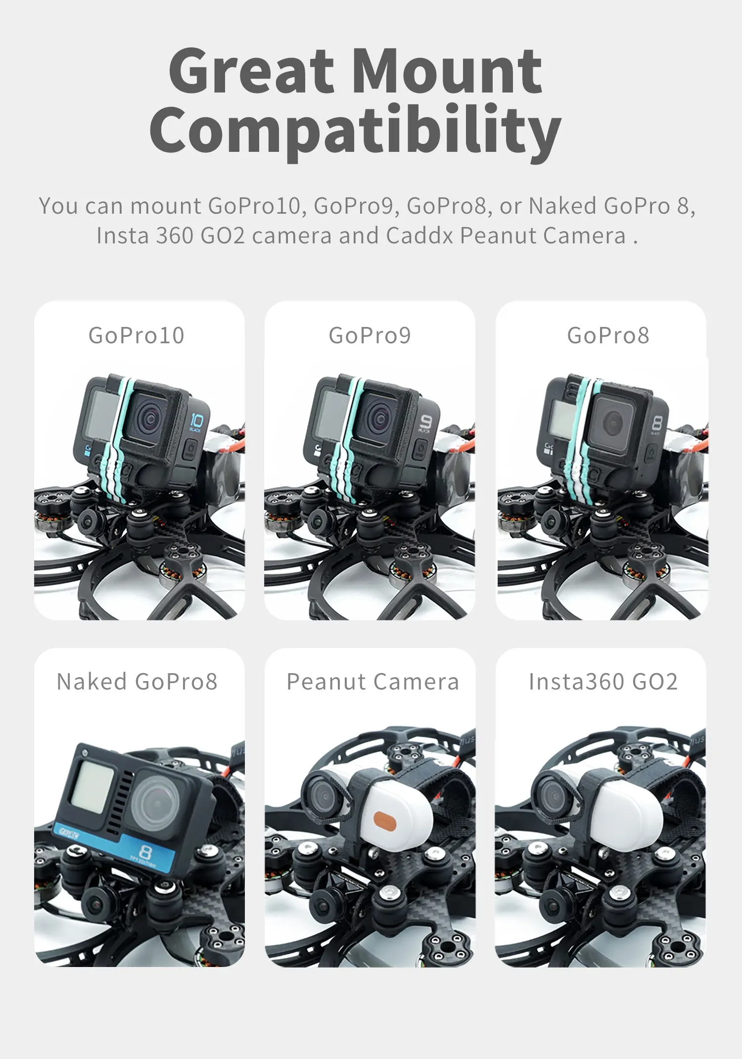 It comes with a 3D Print mount to install the GoPro 9 & GoPro 10. and the Incidental base can carry Insta360 Go2 camera/Naked GoPro Hero 8/Caddx Peanut camera.