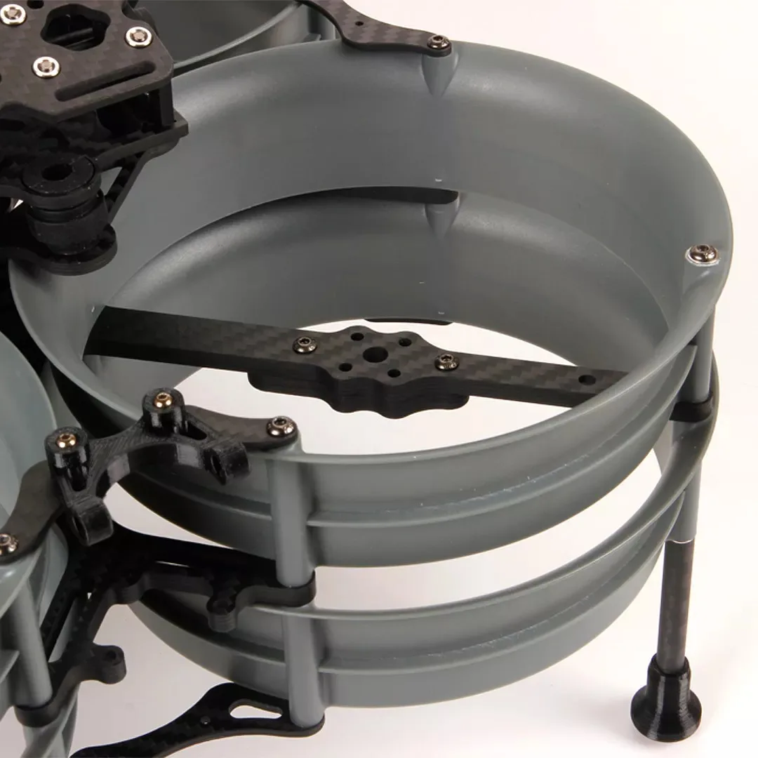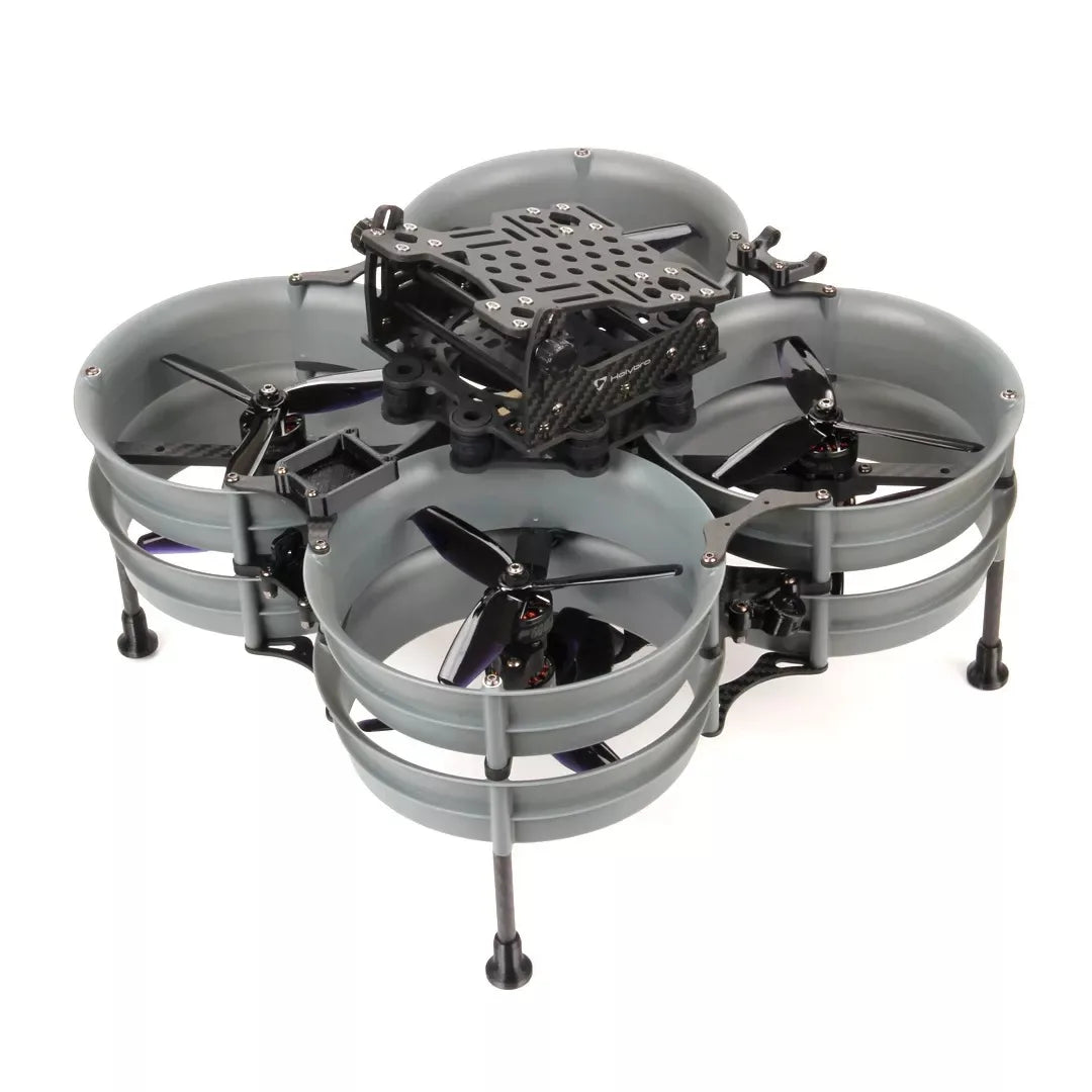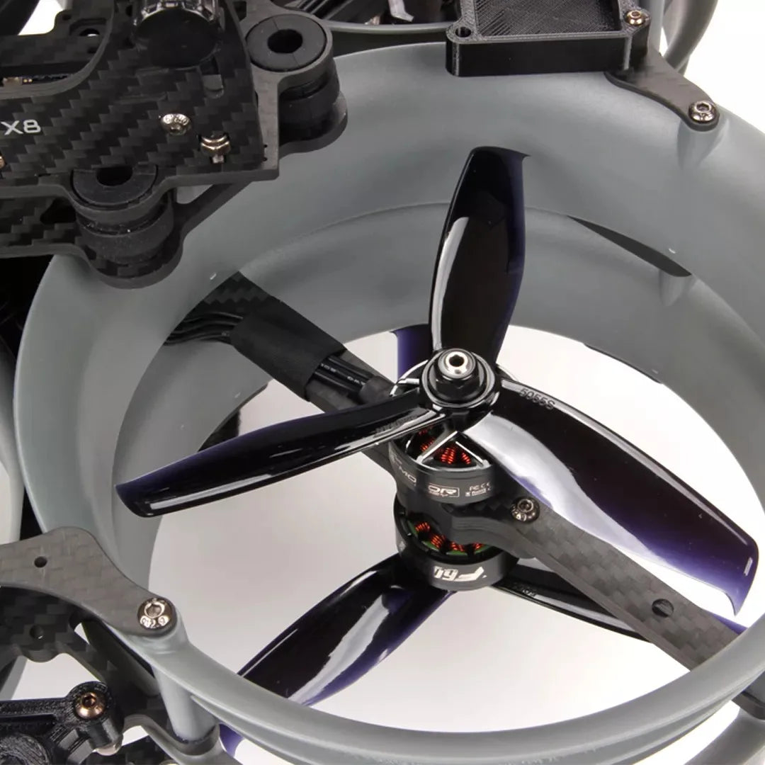 It uses x8 5" props with excellent flight efficiency in cruising speeds with smooth and predictable characteristics, minimal throttle modulation is needed for altitude control. The ducts can be easily removed and changed to carbon fiber caged with ease, landing gear can be removed, and ultimate customizability. It is perfect for both indoor flying and outdoor cruising.