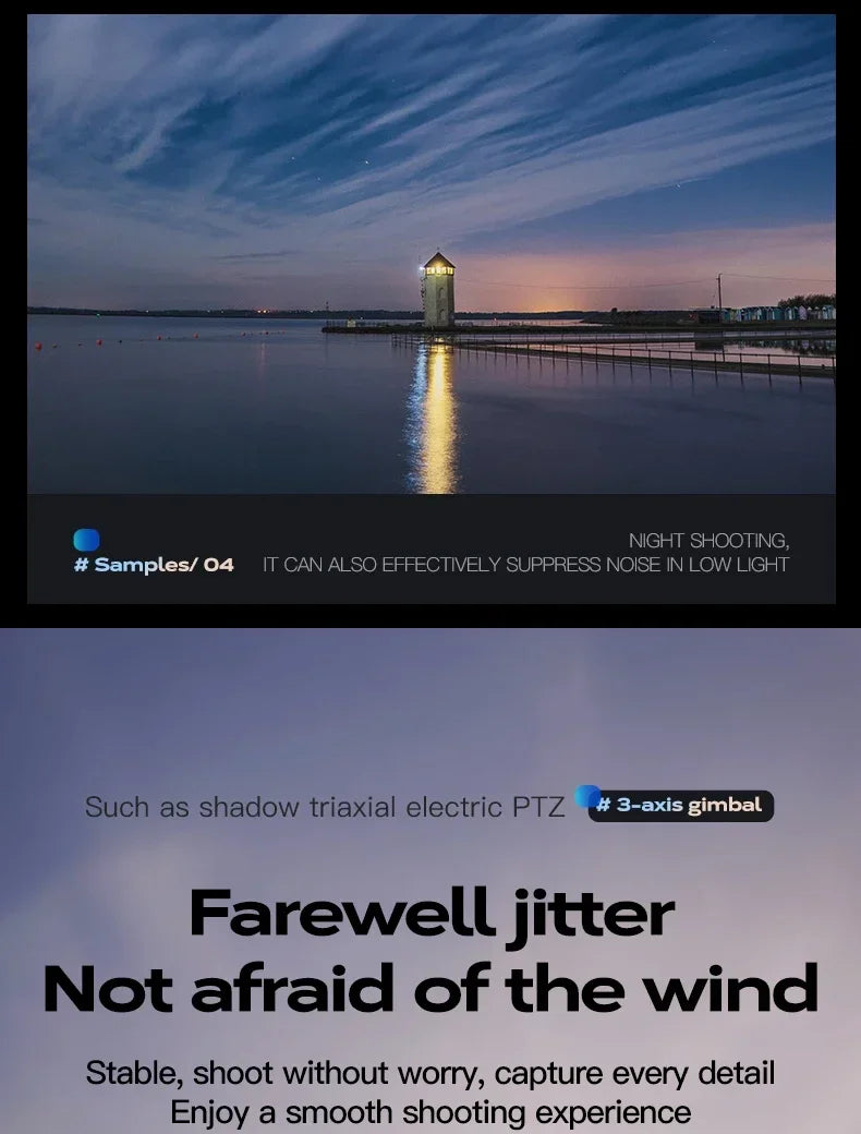 Brushless motor, long service life, durable, can withstand wind speeds of around 5 levels, three-axis self stabilizing gimbal, original storage bag