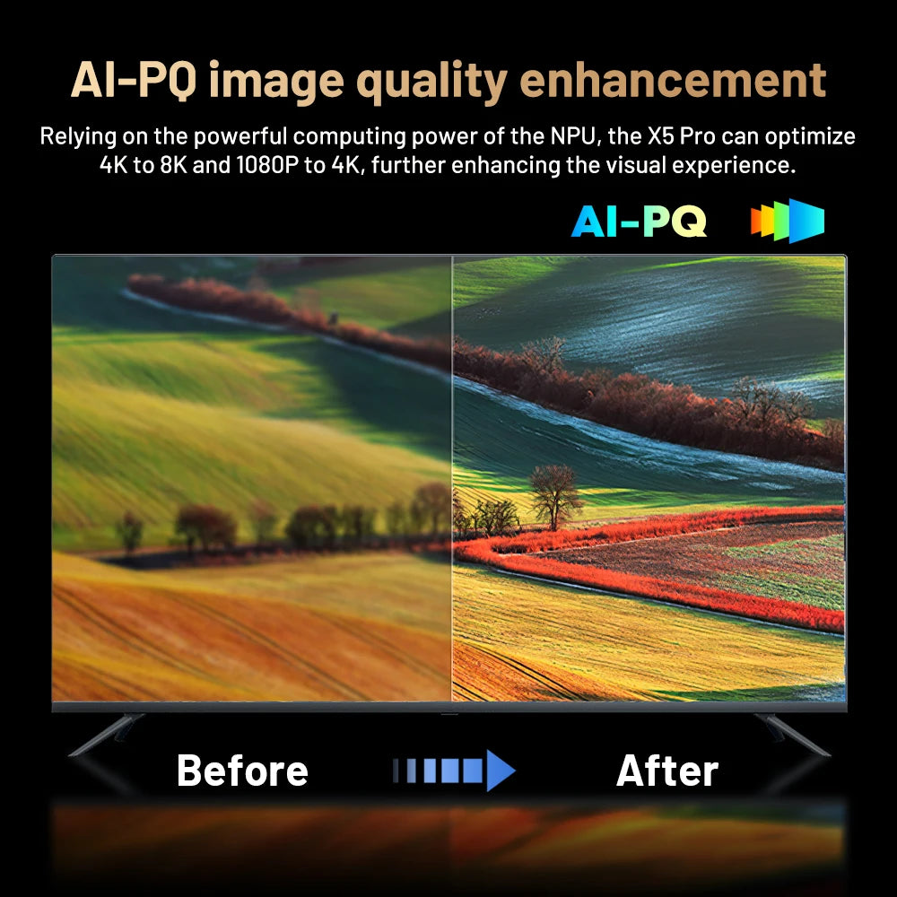 Relying on the powerful computing power of the NPU, the X5 Pro can optimize 4K to 8K and 1080P to 4K, further enhancing the visual experience
