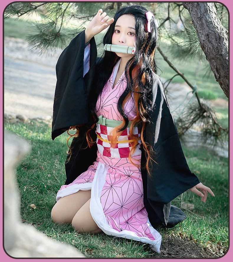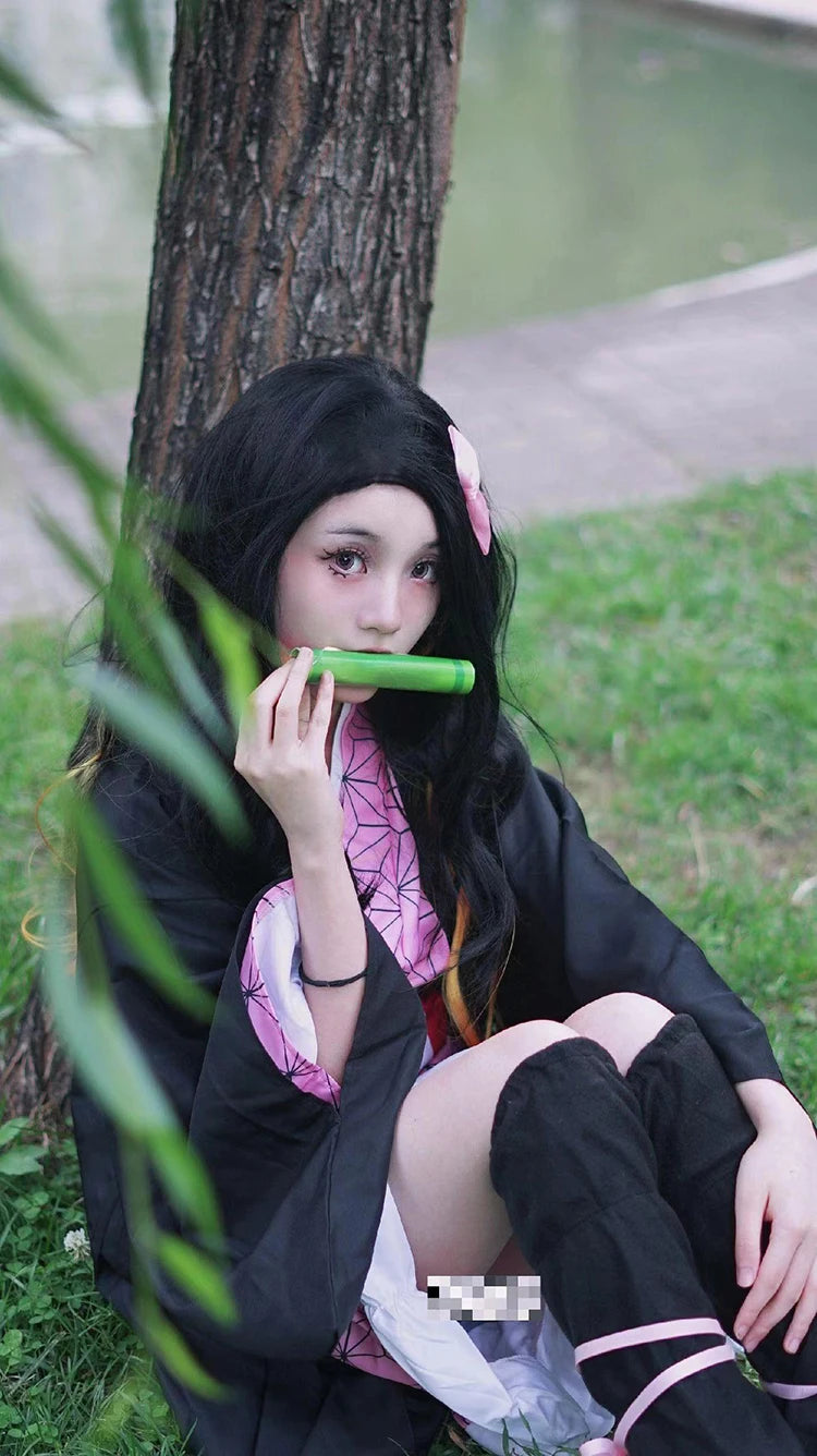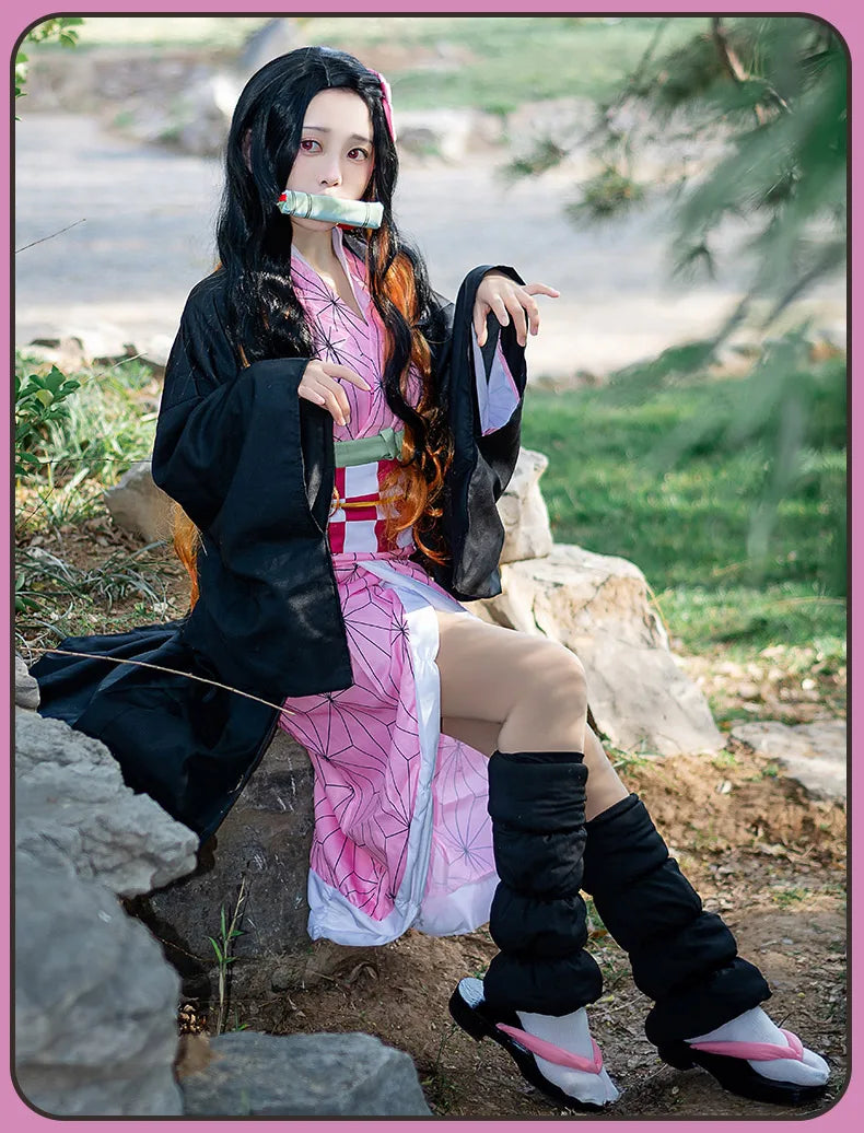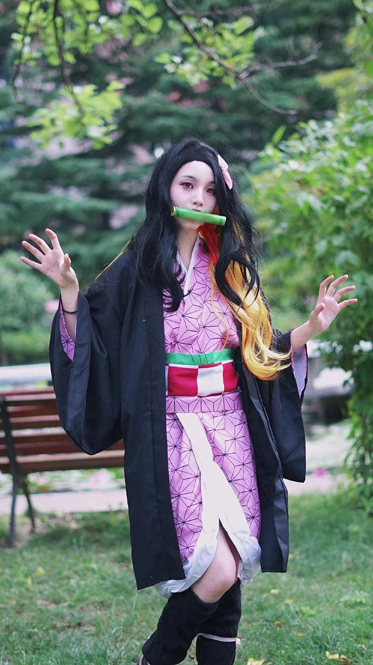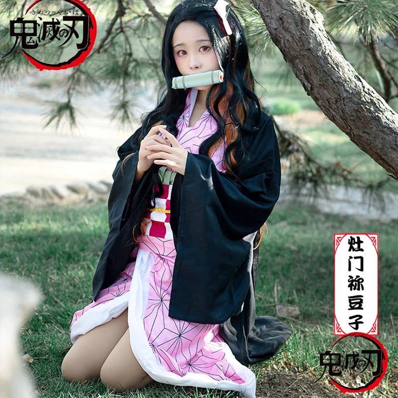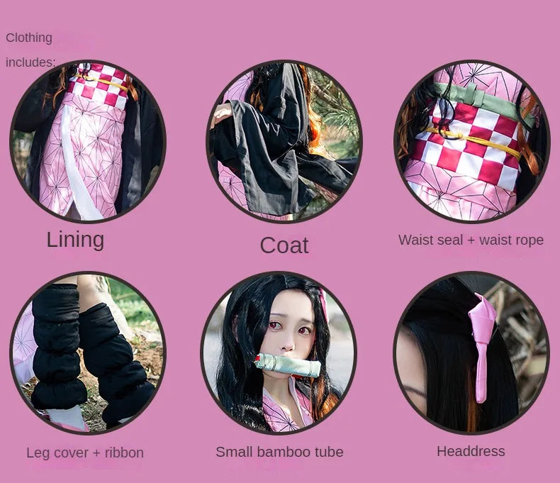 Anime Demon Slayer Kimetsu No Yaiba Kamado Nezuko Cosplay Costume Women Kimono Wig Halloween Carnival Outfit Suit