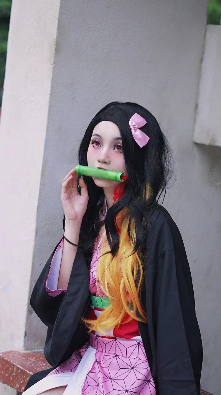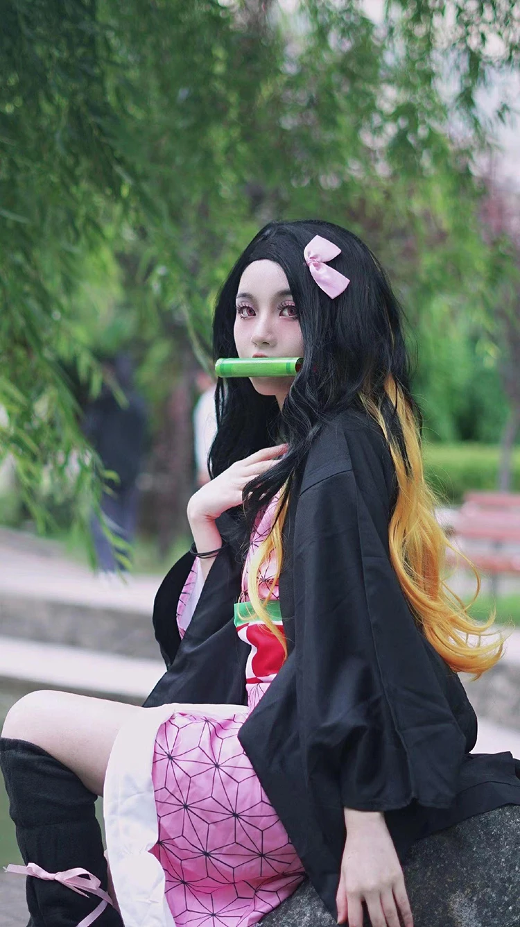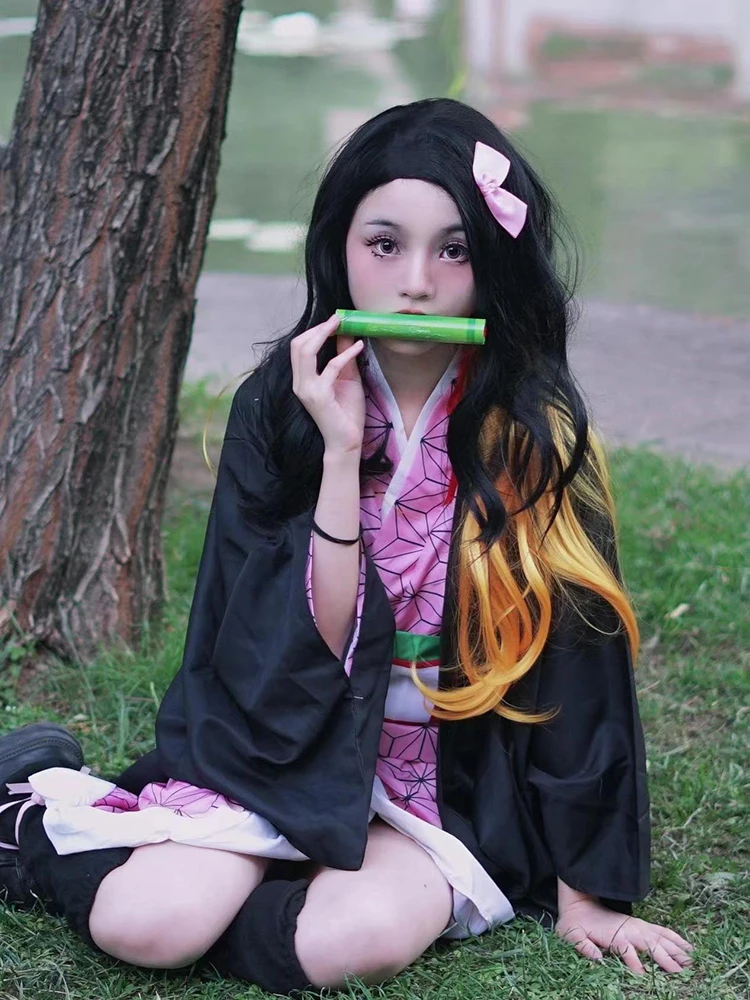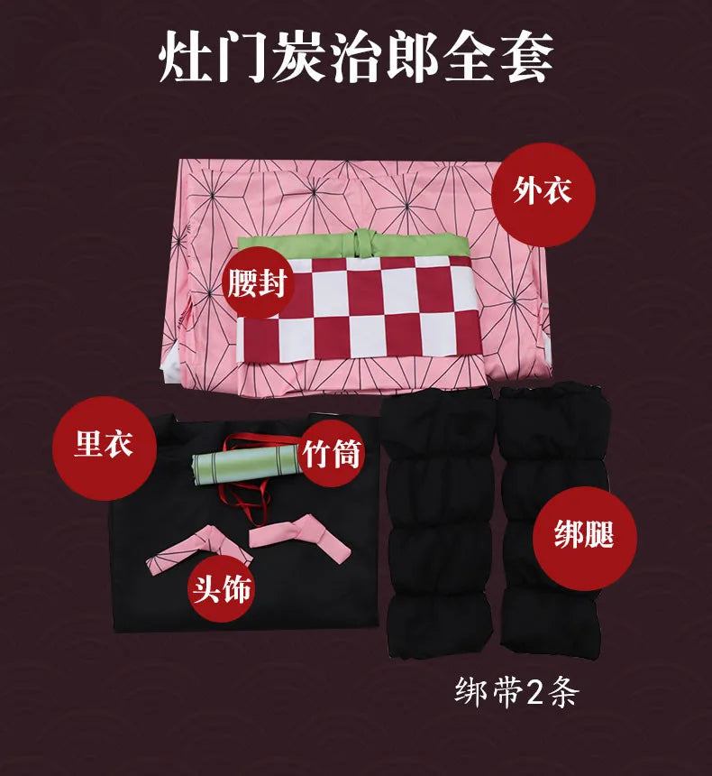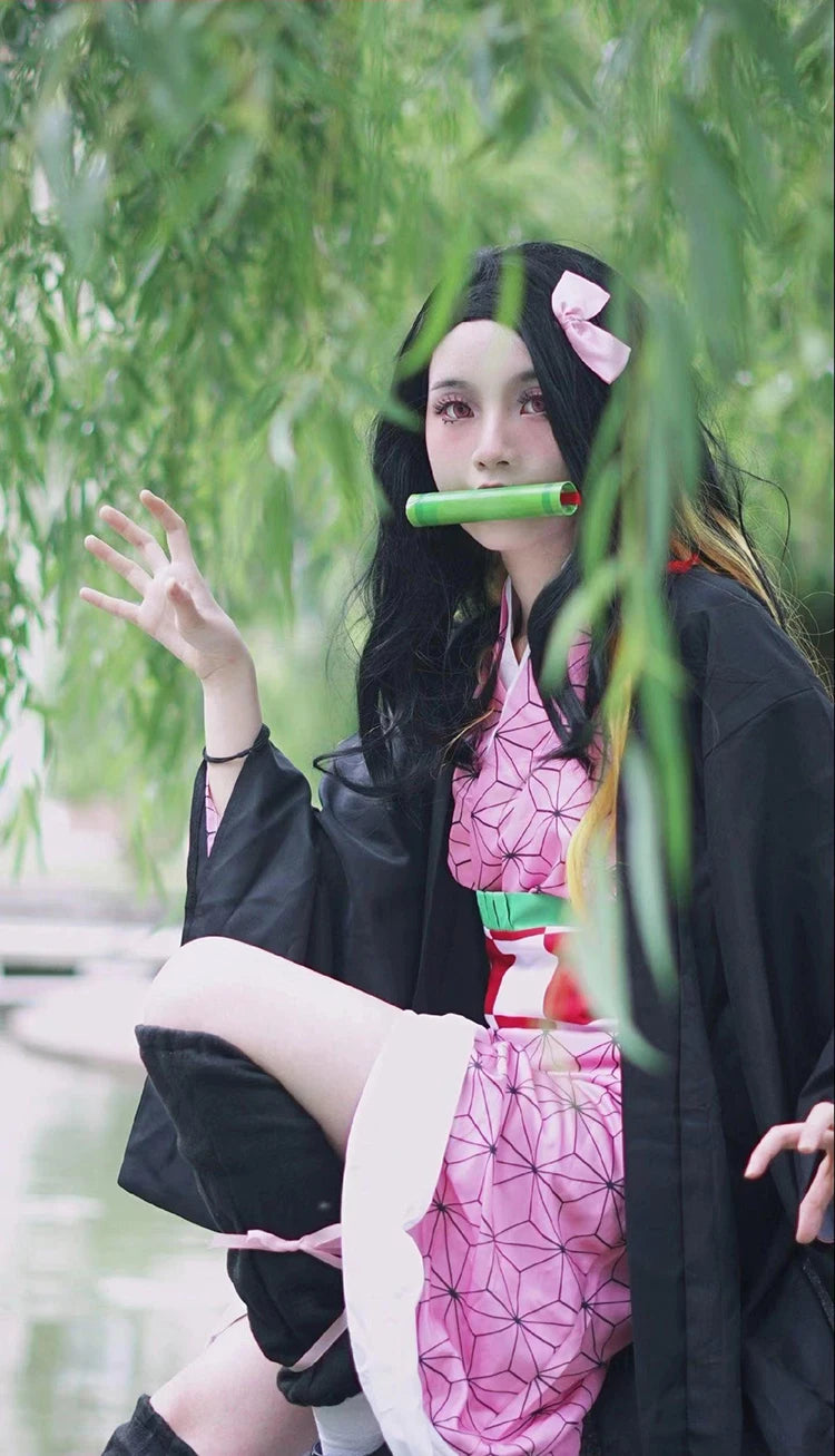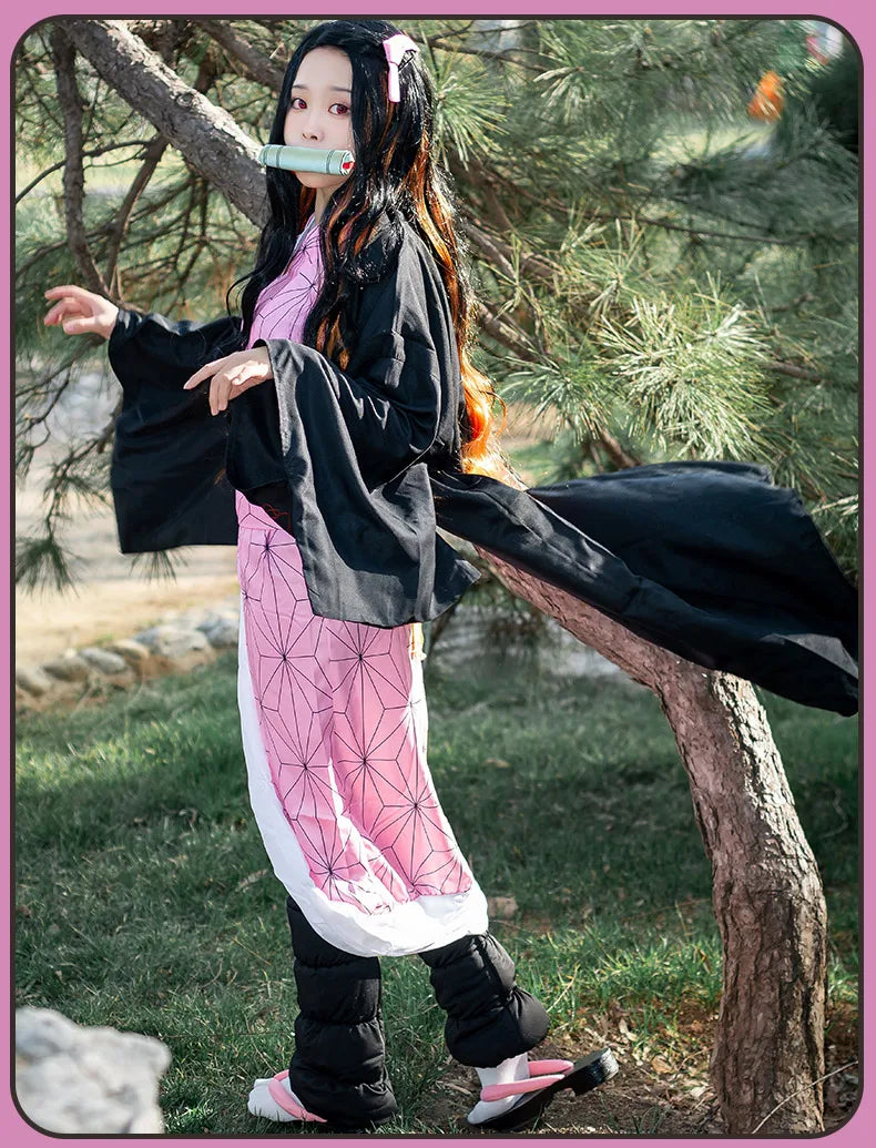 Anime Demon Slayer Kimetsu No Yaiba Kamado Nezuko Cosplay Costume Women Kimono Wig Halloween Carnival Outfit Suit