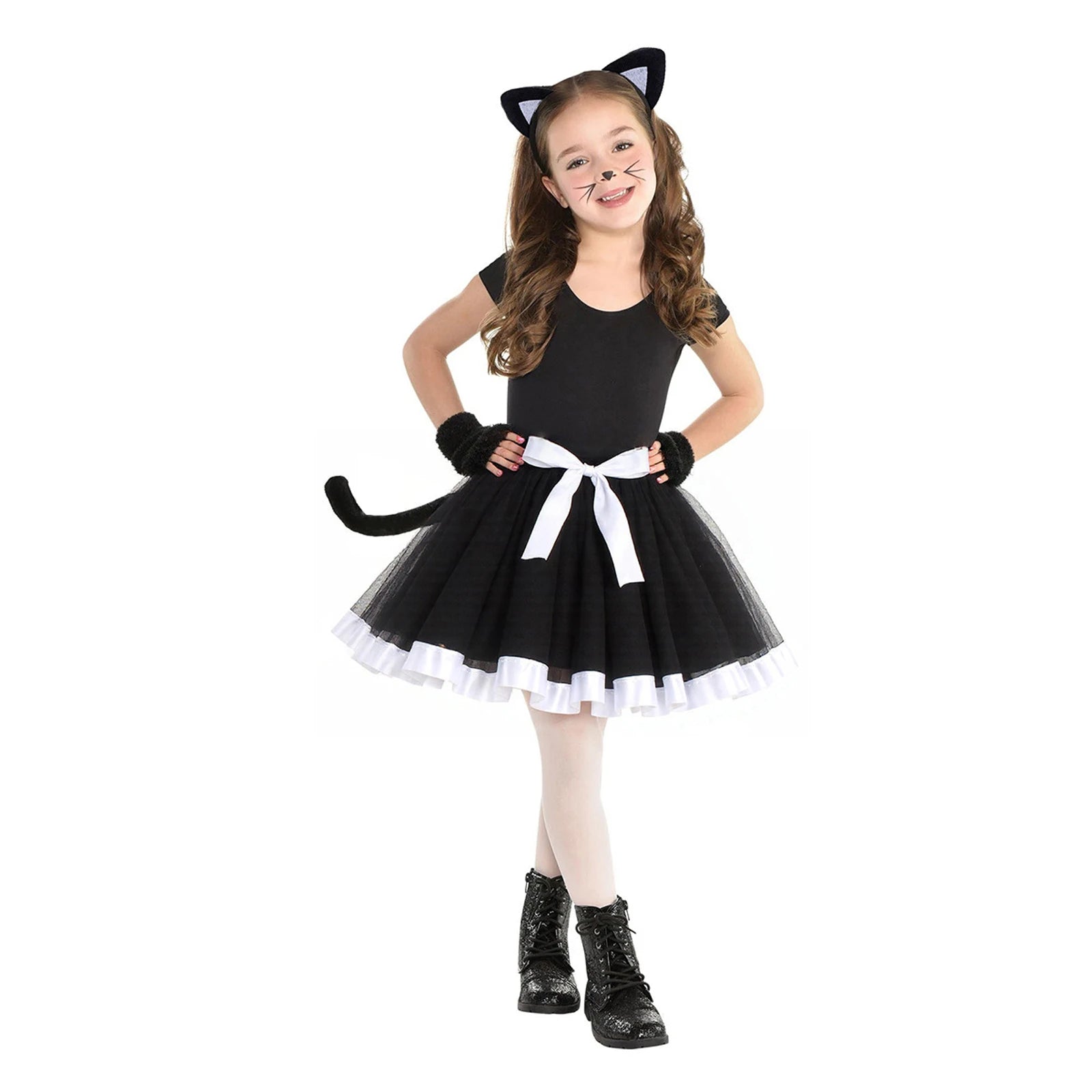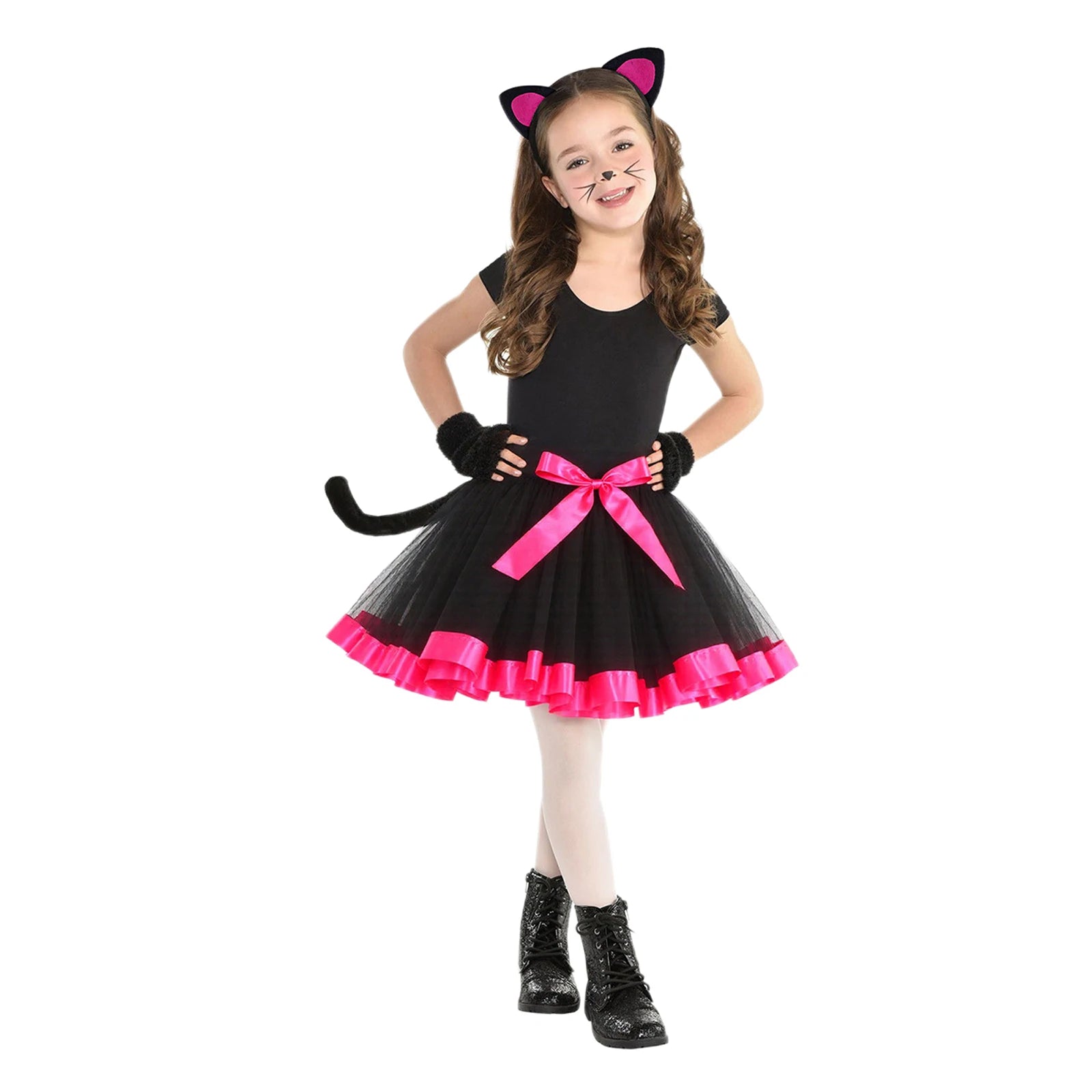 Kids Girls Cat Costume, A-line Tulle Skirt with Hairband Bow Tie Tail Gloves Cosplay Costume for Halloween Party