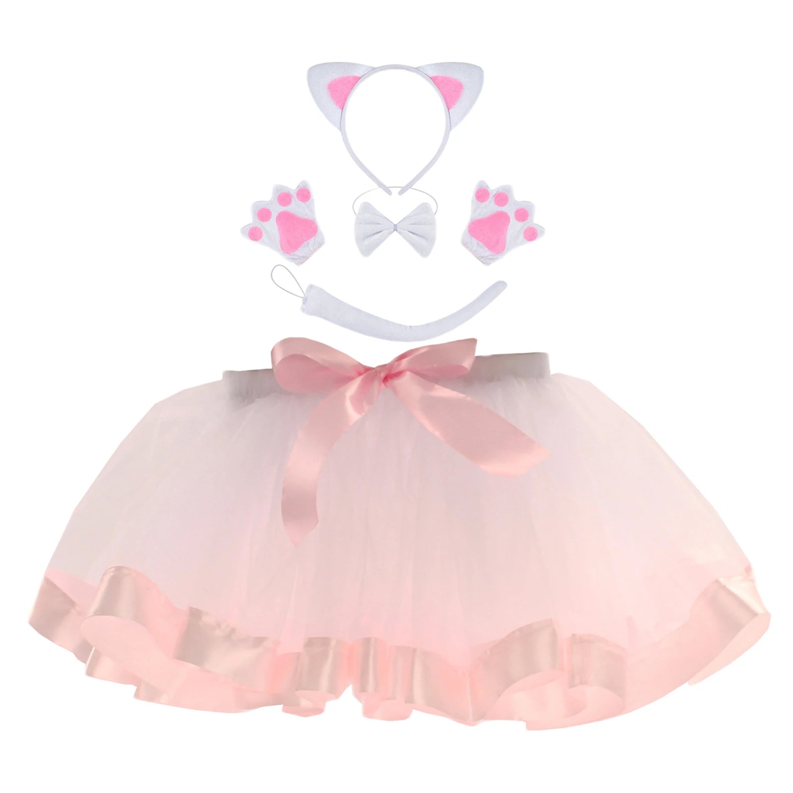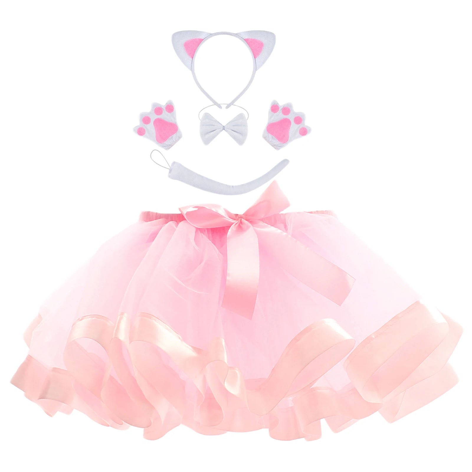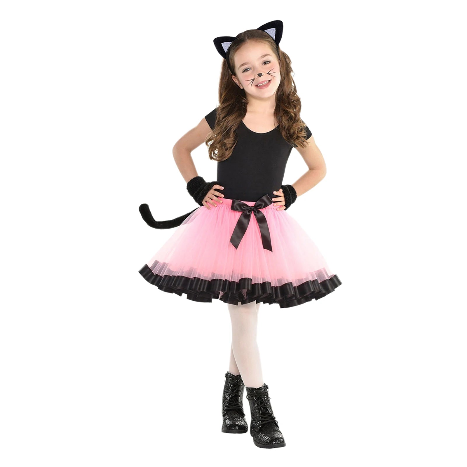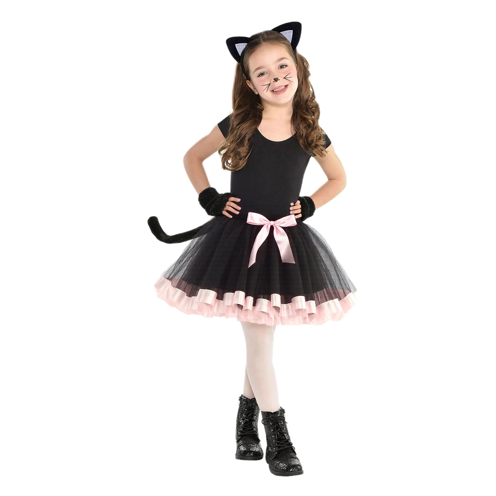 Kids Girls Cat Costume, A-line Tulle Skirt with Hairband Bow Tie Tail Gloves Cosplay Costume for Halloween Party