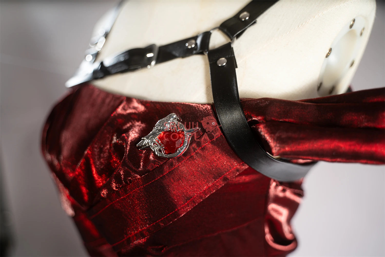 4. Exquisite Embellishments: The back waist showcases wave-like folds accented with delicate rhinestones, while the leather collar is complemented by a striking red metal pendant.