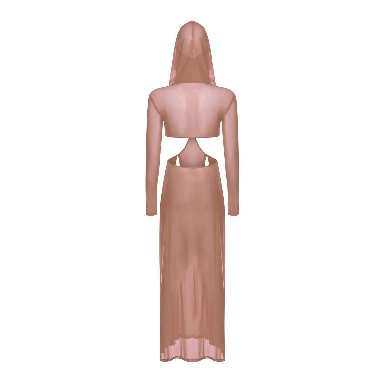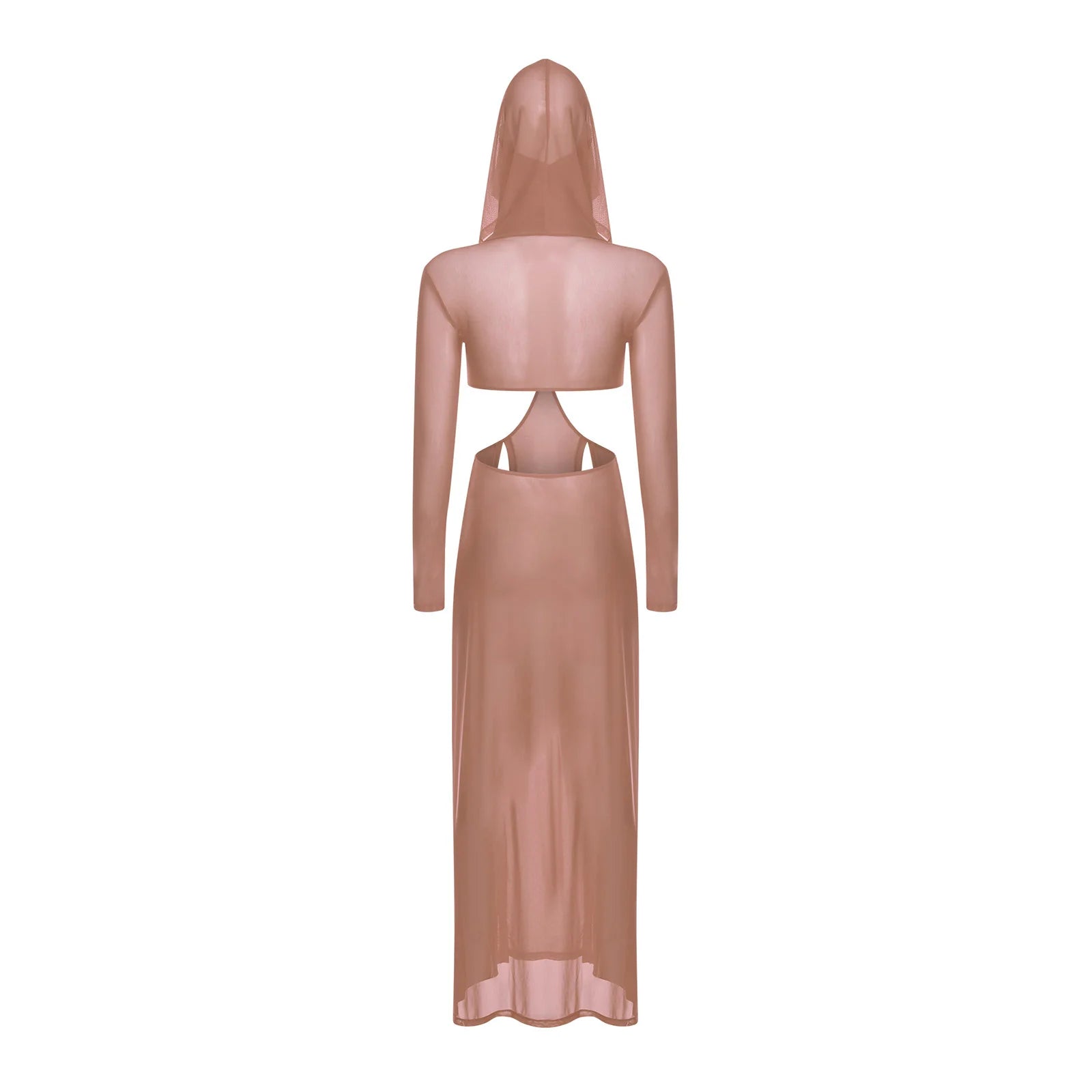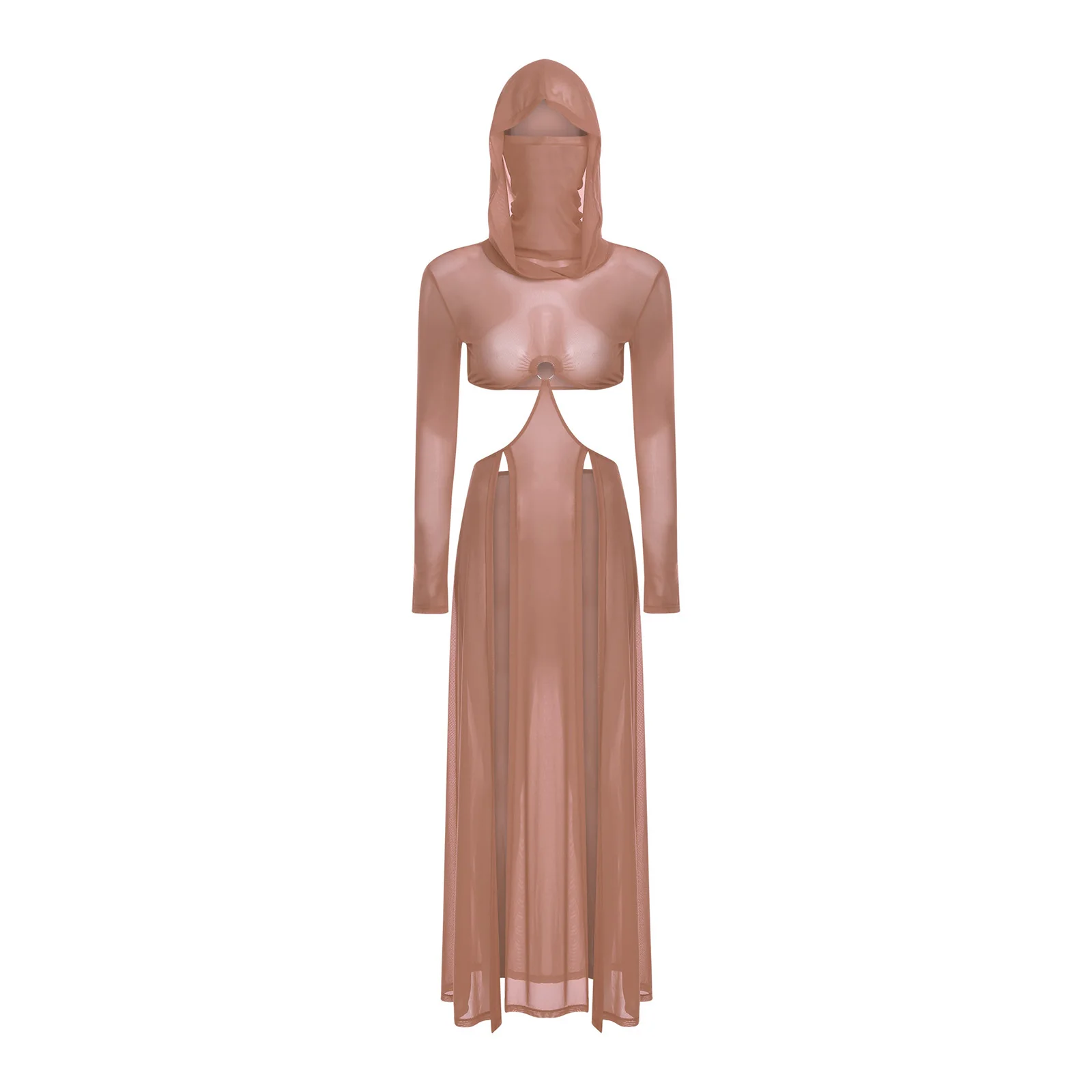 A sheer coverup dress for women, is designed with hooded, long sleevees, high waist, high slit maxi dress, with integrated face mask.