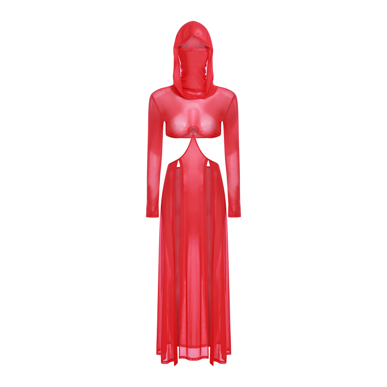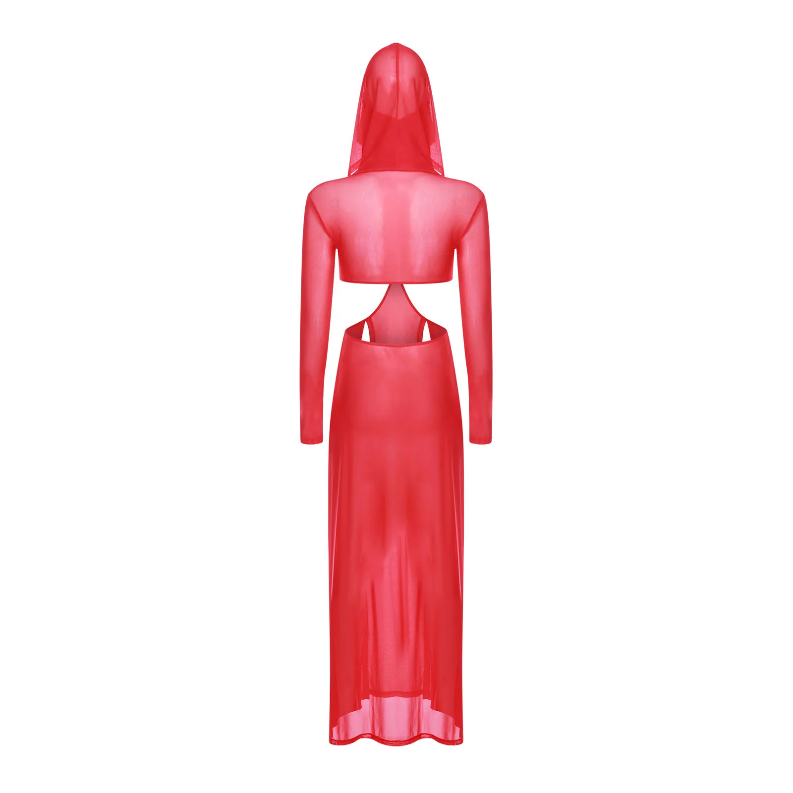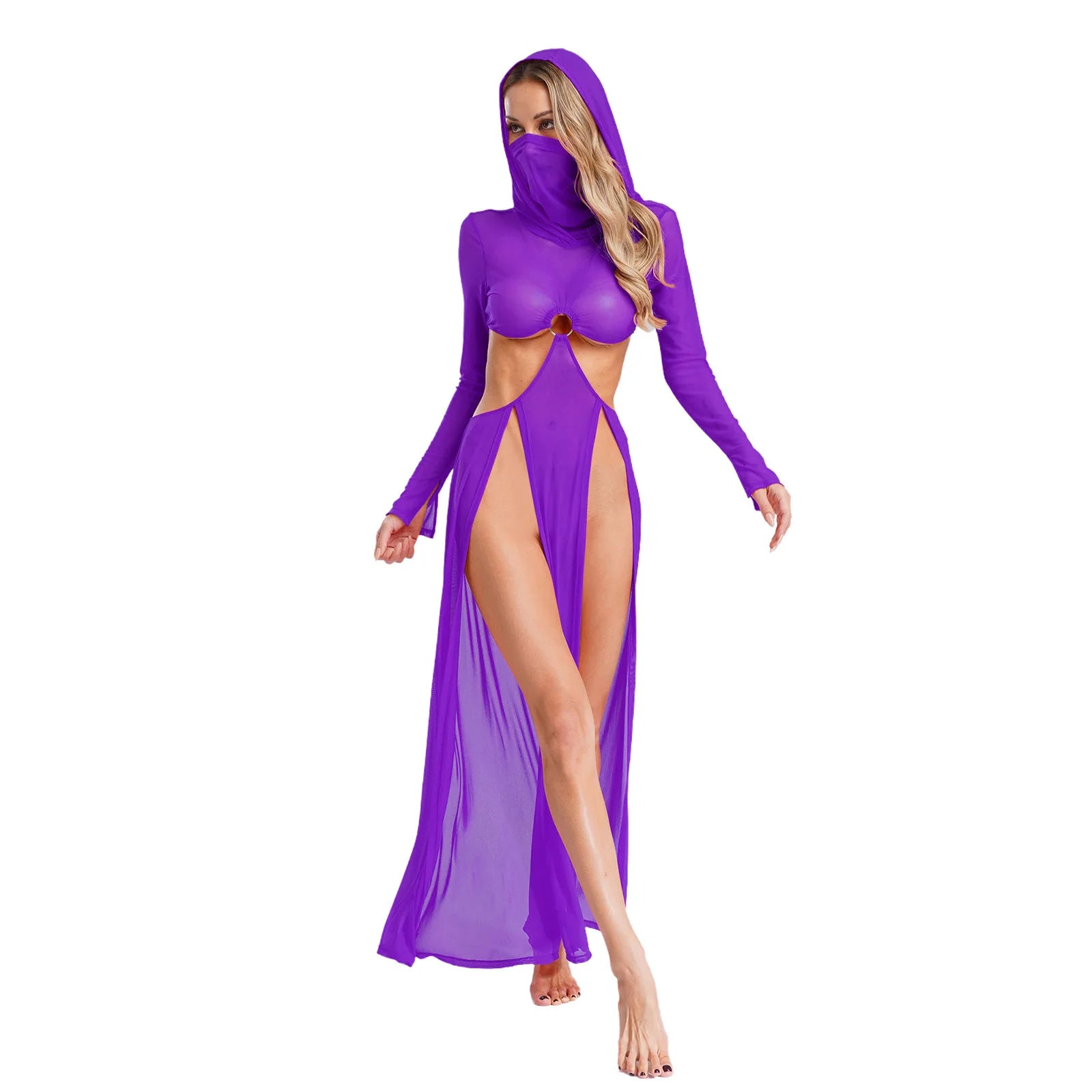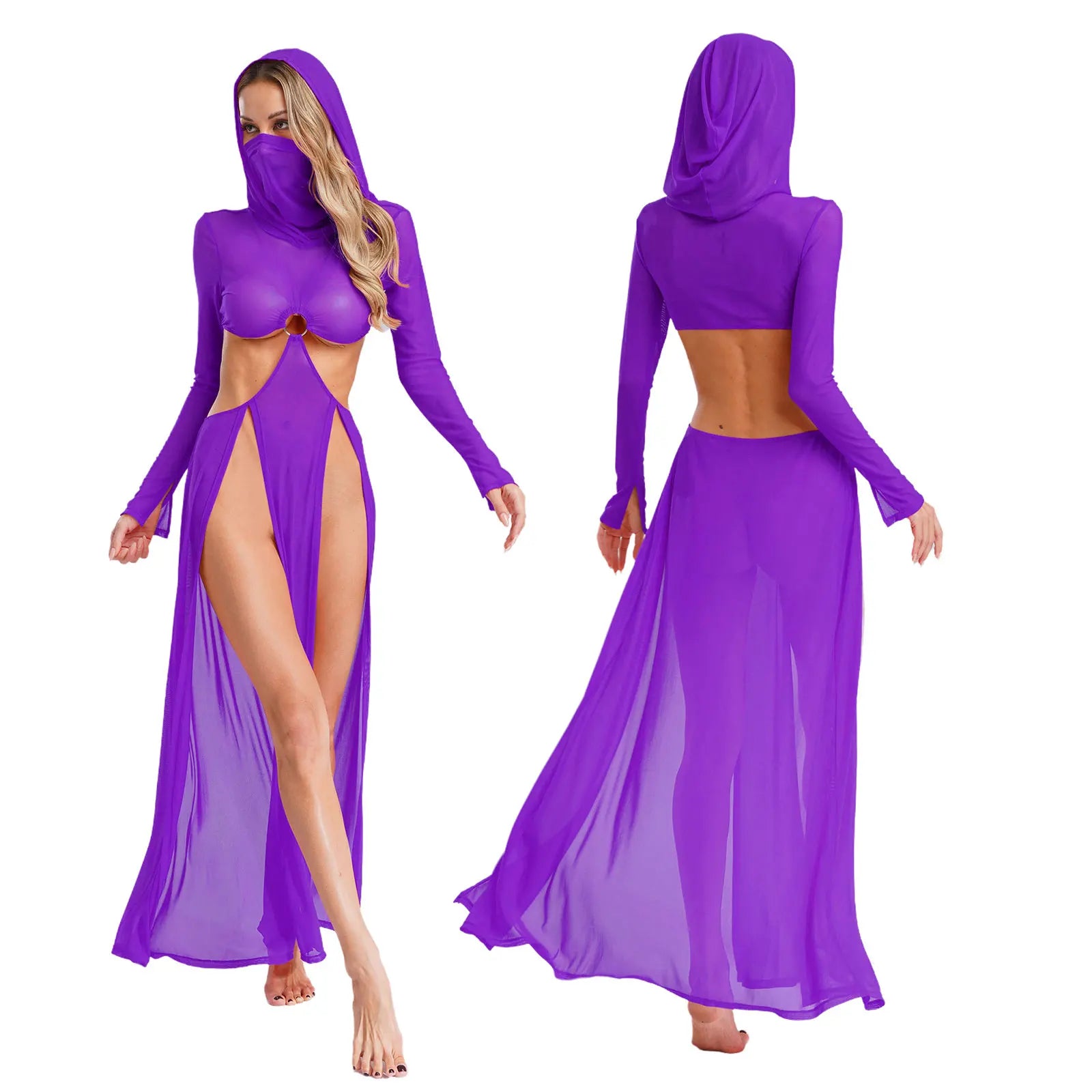 A sheer coverup dress for women, is designed with hooded, long sleevees, high waist, high slit maxi dress, with integrated face mask.