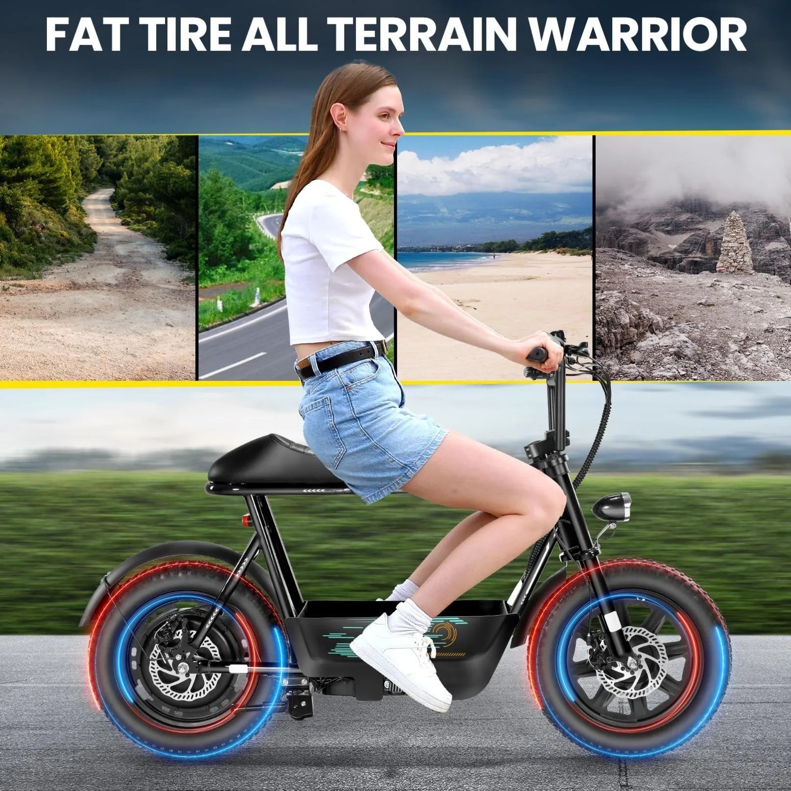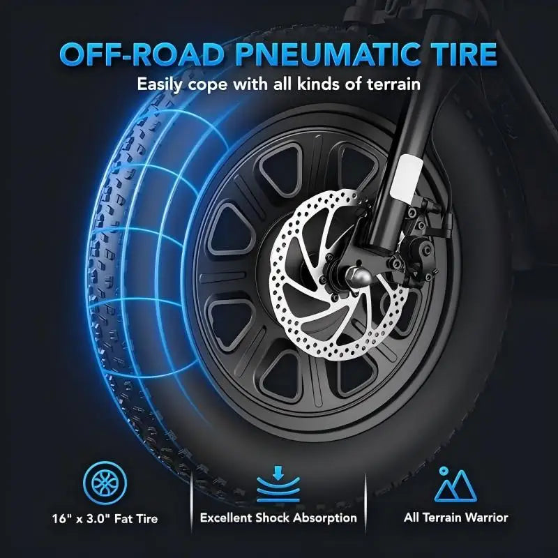 【𝘼𝙡𝙡-𝙏𝙚𝙧𝙧𝙖𝙞𝙣 𝙈𝙖𝙨𝙩𝙚𝙧𝙮】:𝟭𝟲*𝟯" 𝗳𝗮𝘁 𝘁𝗶𝗿𝗲𝘀 provide a larger contact area, giving the scooter better stability and grip on a variety of surfaces. Fat tires better absorb vibrations on the road, providing a smooth and comfortable ride even on uneven roads,𝗿𝗲𝗱𝘂𝗰𝗶𝗻𝗴 𝘁𝗵𝗲 𝗿𝗶𝘀𝗸 of a blowout when driving over sharp objects, more suitable for extreme or irregular terrain, such as off-road mountain or beach, expanding the range of riding environments.