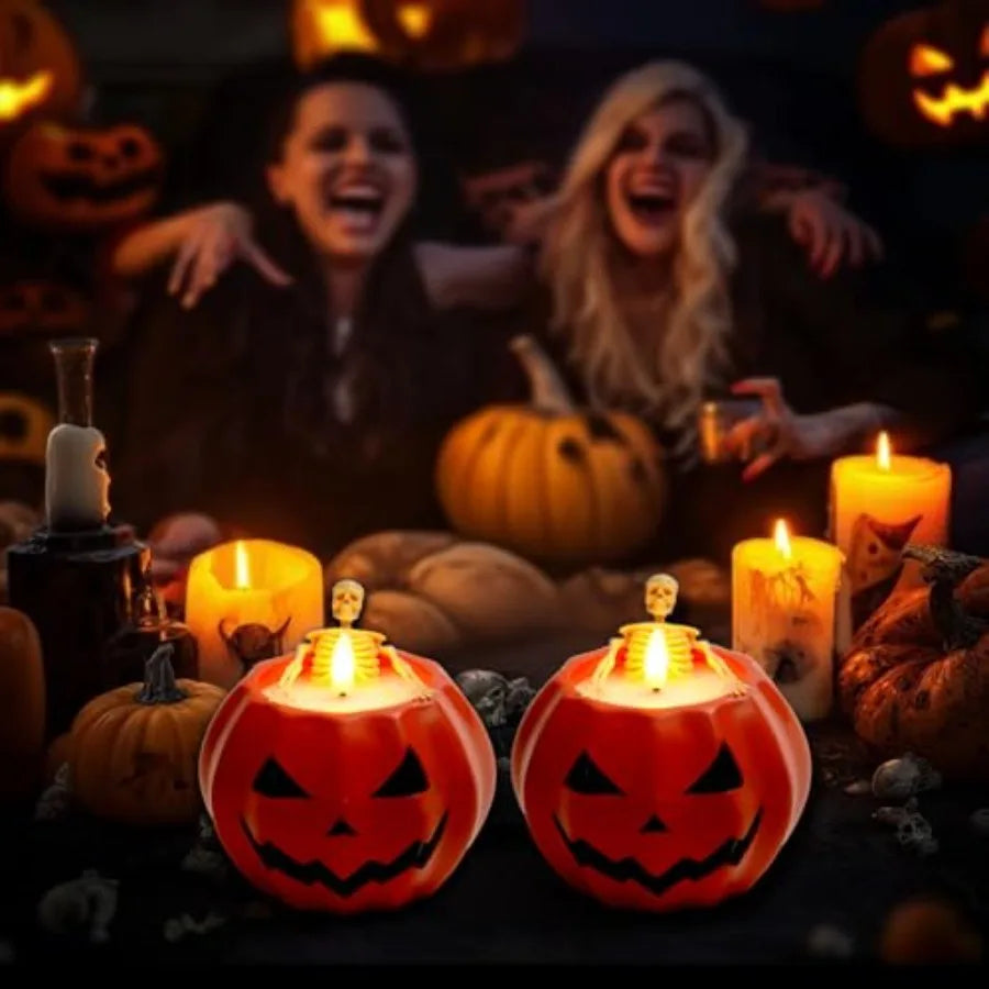 【Realistic Design】The shell of the jack-o-lantern shaped candle is filled with real wax, making it look like a skeleton taking a wax bath in a pumpkin lantern. The head on the skeleton swivels for posing. After opening light, the flame will emit a warm yellow glow, darkening and brightening, producing a realistic flickering effect