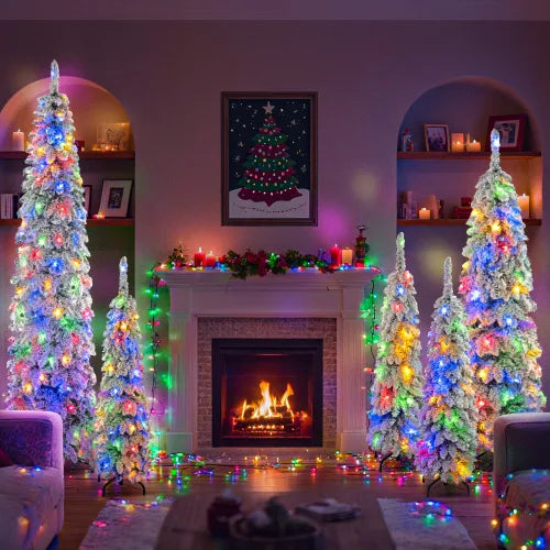 Value Set of 5 Christmas Trees: This set includes five pencil-style flocked Christmas trees: three 4ft trees, one 6ft tree, and one 8ft tree. Arrange them together for a layered centerpiece or place them in different corners of your home to create a warm, cohesive Christmas atmosphere throughout the entire space.