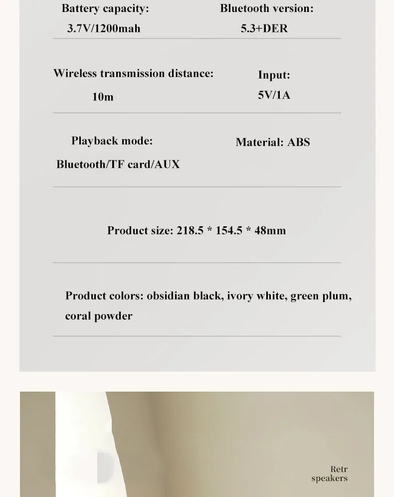 Packing list:1*Bluetooth speaker,1*Charging cable,1*User manual (No retail box)