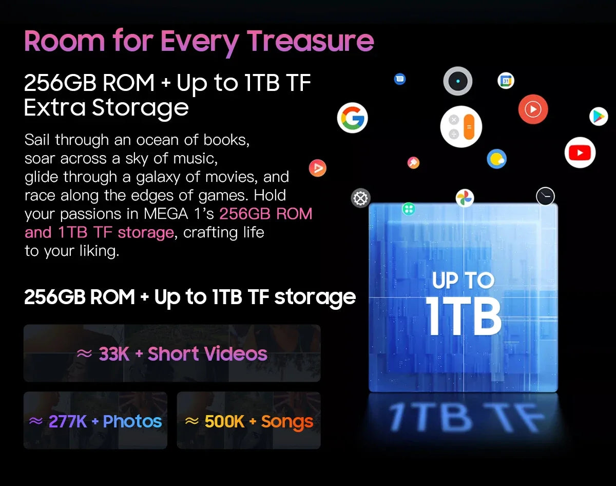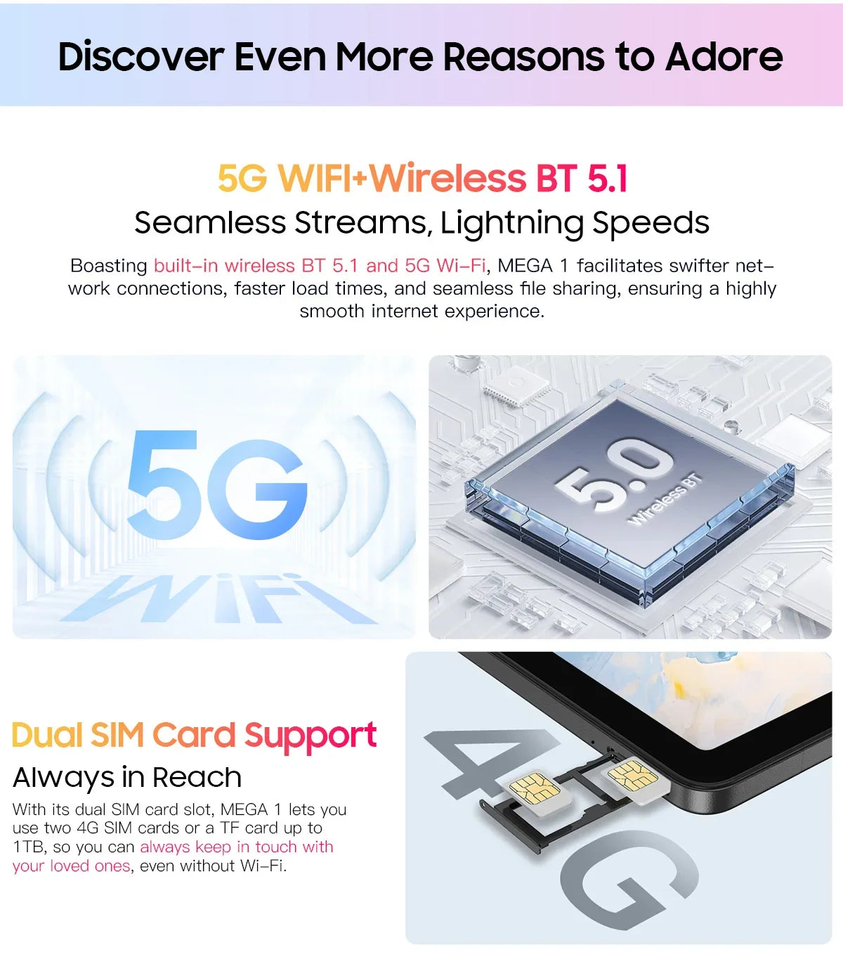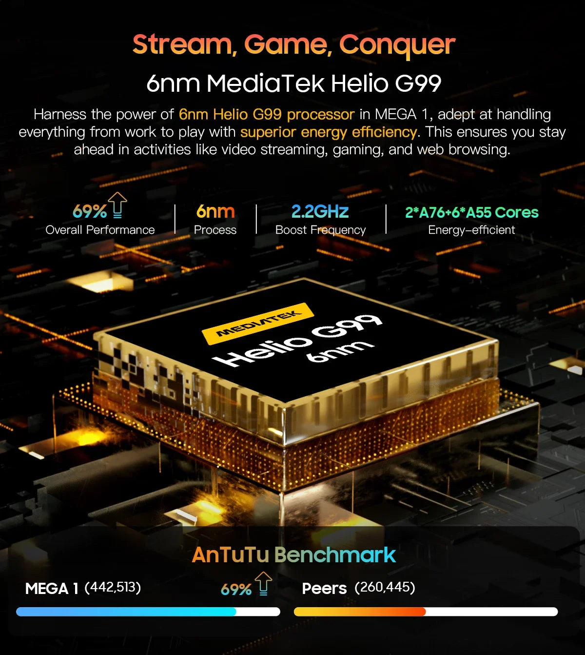 Slim at only 7.6mm and light at 528g, MEGA 1 is perfect for on-the-go. Enjoy the comfort in your hands and a joyous experience with its 11.5-inch ultra-large 2.4K screen and seamlessly aerospace-grade aluminum body.