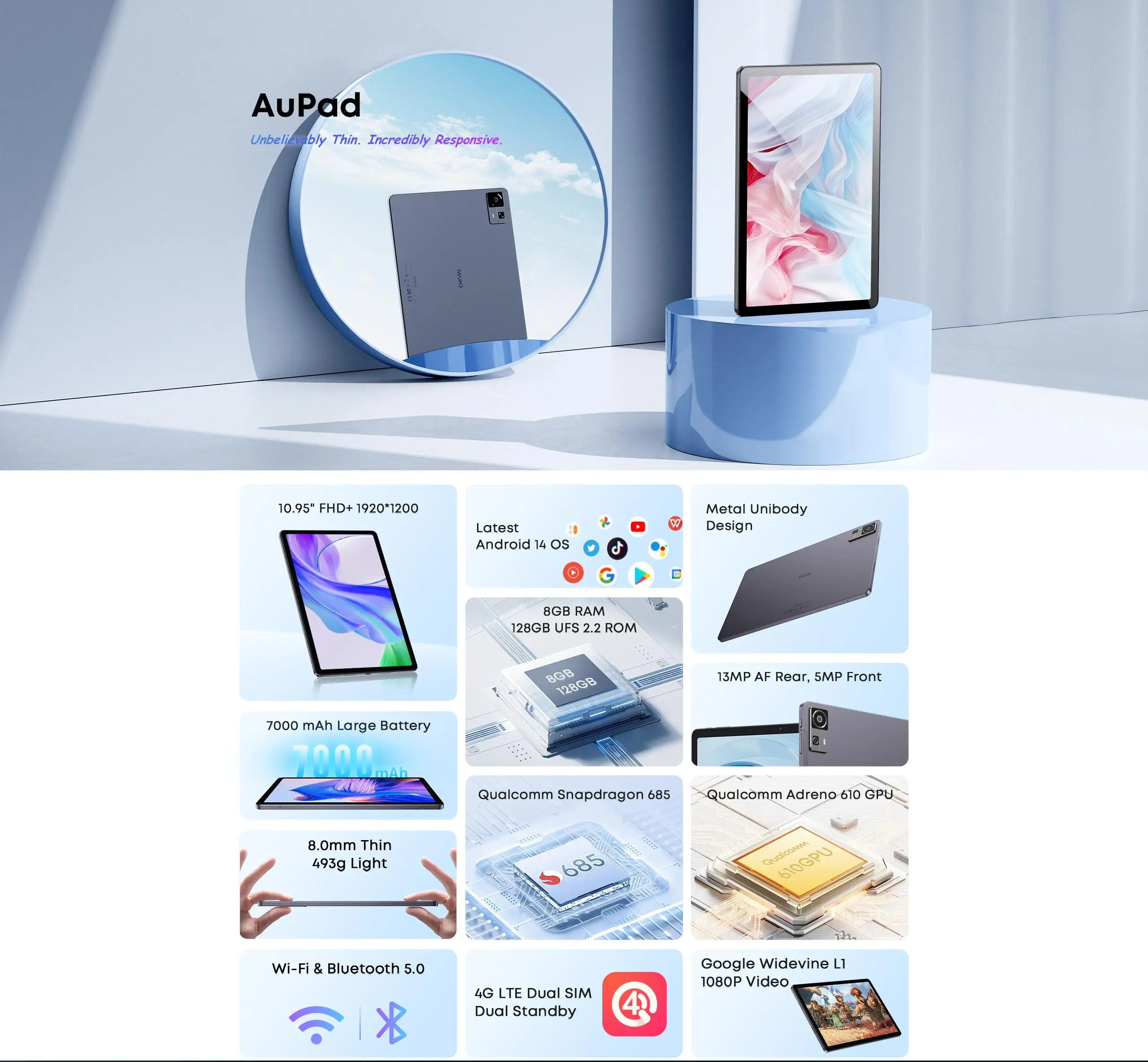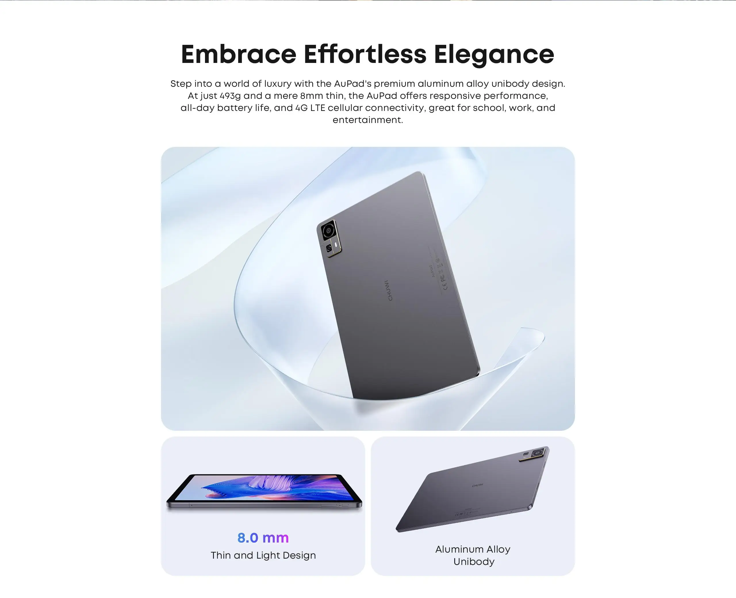 Step into a world of luxury with the AuPad's premium aluminum alloy unibody designAt just 493g and a mere 8mm thin, the AuPad offers responsive performance.all-day battery life, and 4G LTE cellular connectivity, great for school, work, and entertainment.