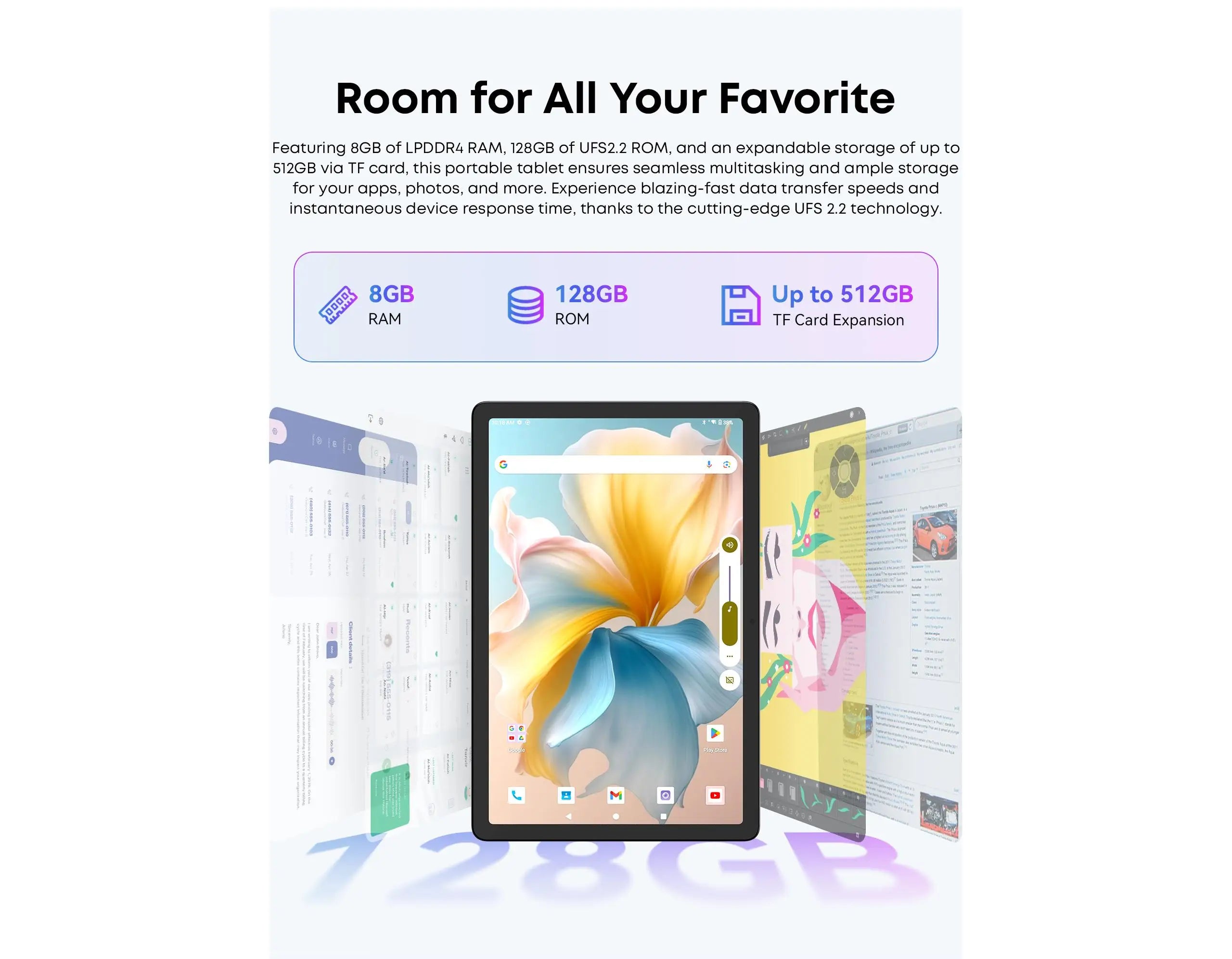 Featuring 8GB of LPDDR4 RAM, 128GB of UFS2.2 ROM, and an expandable storage of up to512GB via TF card, this portable tablet ensures seamless multitasking and ample storagefor your apps, photos, and more. Experience blazing-fast data transfer speeds andinstantaneous device response time, thanks to the cutting-edge UFS 2.2 technology
