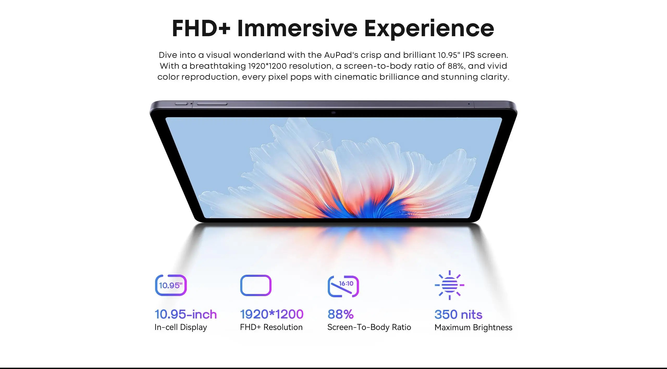 Dive into a visual wonderland with the AuPad's crisp and brilliant 10.95" iPs screen.With a breathtaking 1920*1200 resolution, a screen-to-body ratio of 88%, and vividcolor reproduction, every pixel pops with cinematic brilliance and stunning clarity