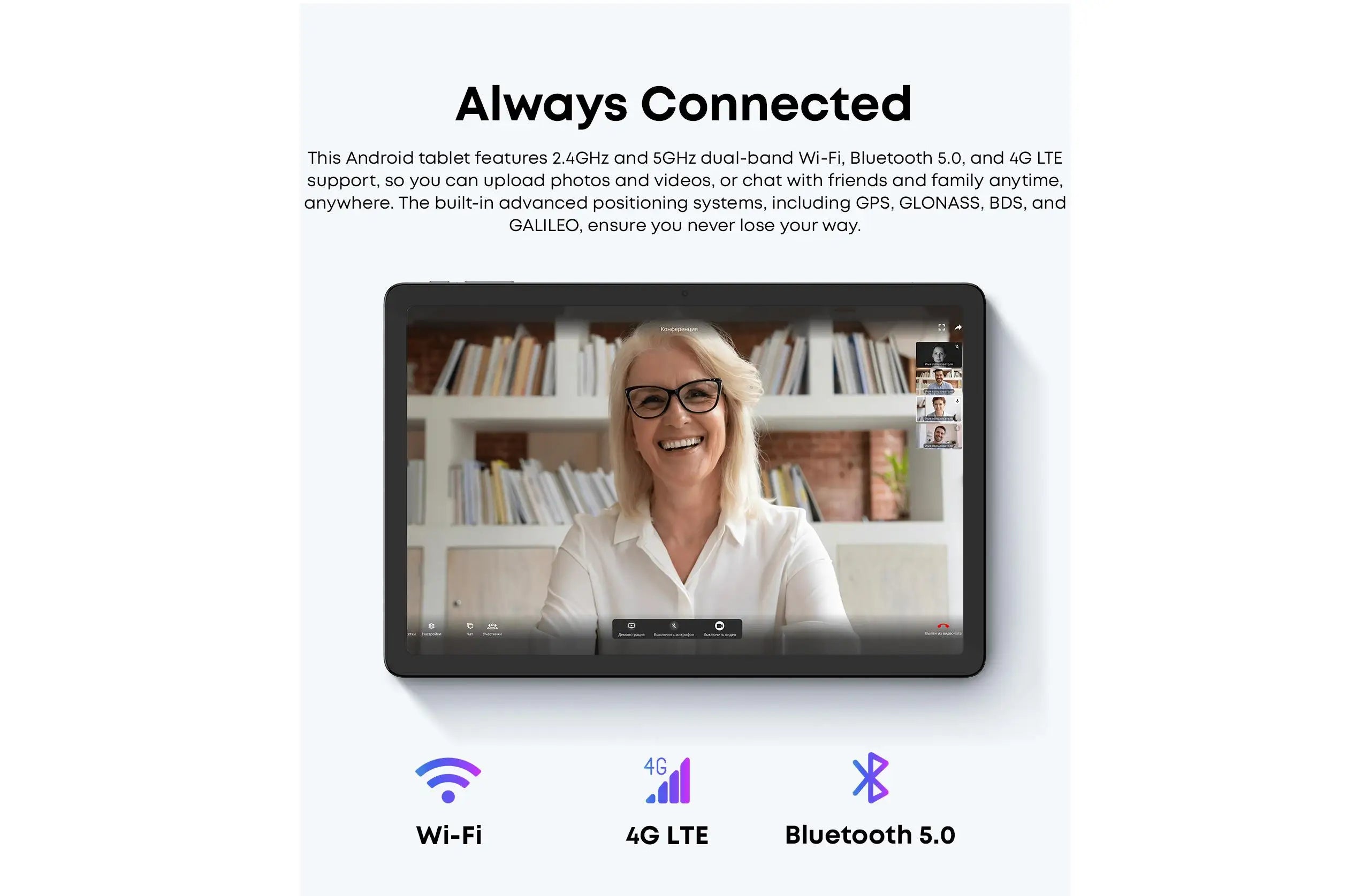 This Android tablet features 2.4GHz and 5GHz dual-band Wi-fi, Blvetooth 5.0, and 4G LTEsupport, so you can upload photos and videos, or chat with friends and family anytime.anywhere. The built-in advanced positioning systems, including GPS, GLONASS. BDs, andGALlLEO,ensure you never lose your way.