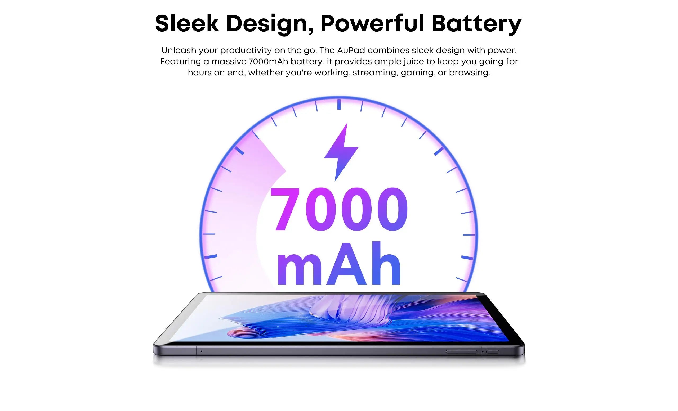 Unleash your productivity on the go. The AuPad combines sleek design with power.Featuring a massive 7000mAh battery, it provides ample juice to keep you going forhours on end, whether you're working, streaming, gaming, or browsing.