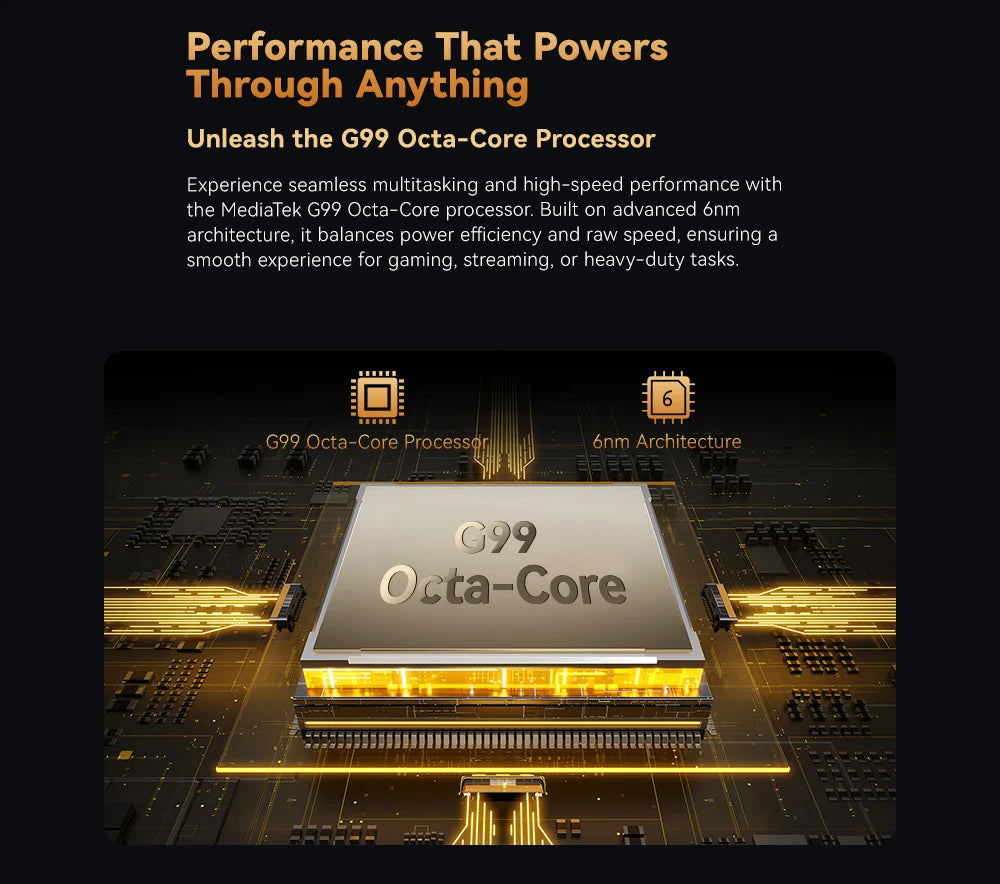 Experience seamless multitasking and high-speed performance with the MediaTek G99 Octa-Core processor. Built on advanced 6nm architecture, it balances power efficiency and raw speed, ensuring a smooth experience for gaming, streaming, or heavy-duty tasks.
