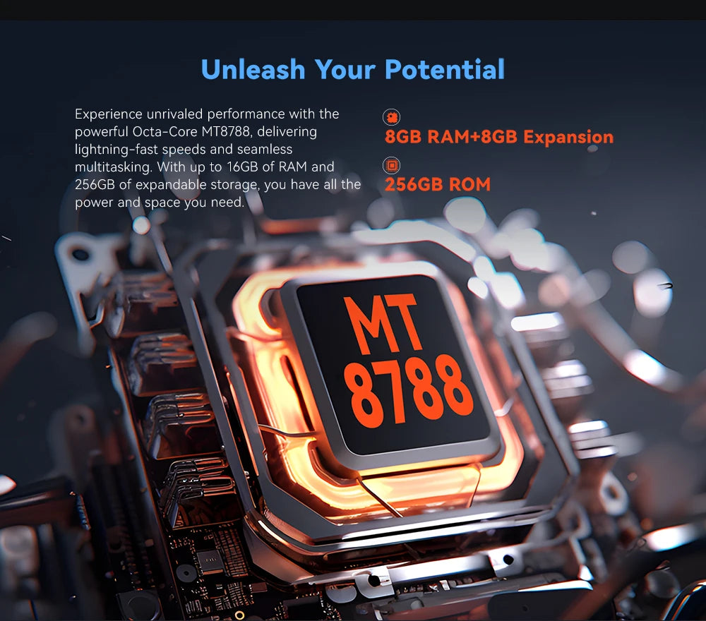 Experience unrivaled performance with the powerful Octa-Core MT8788, delivering lightning-fast speeds and seamless multitasking. With up to 16GB of RAM and 256GB of expandable storage, you have all the power and space you need.