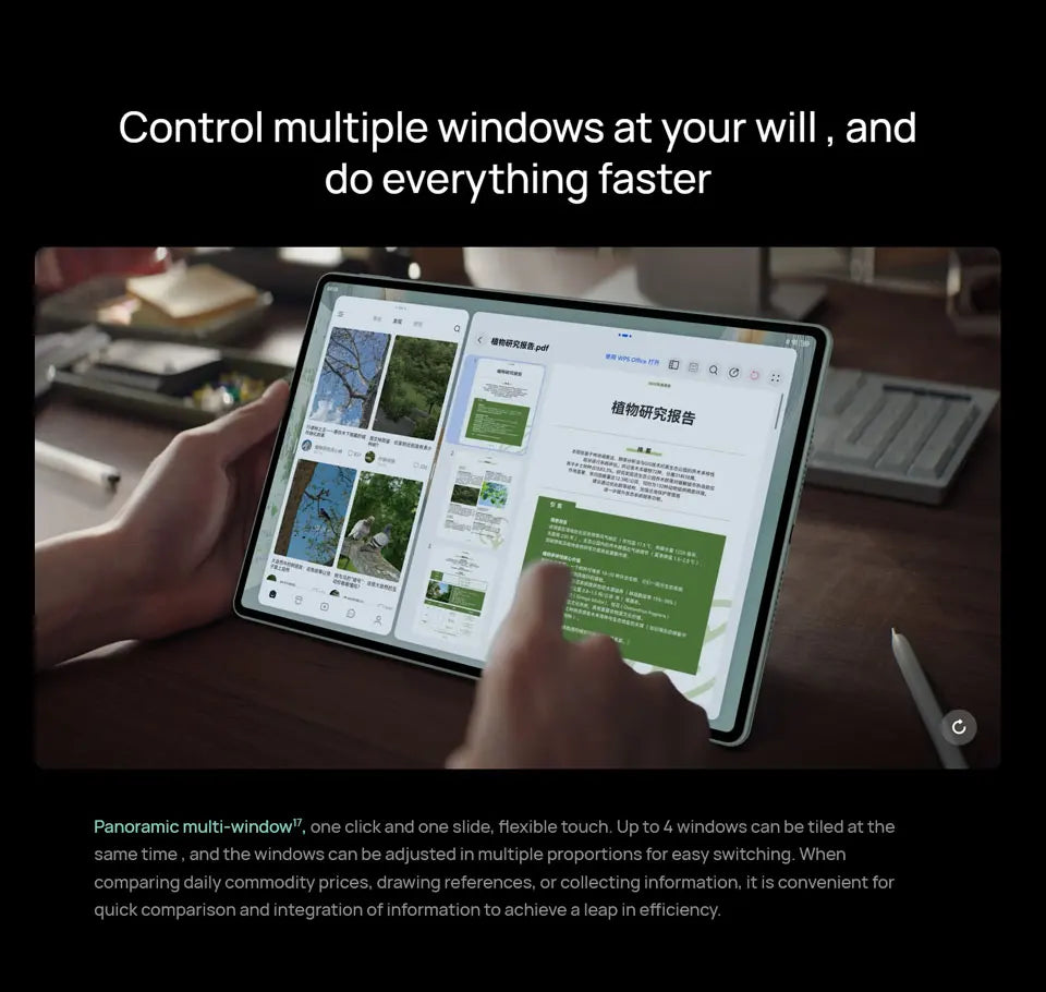 > Features: Supports Huawei Notes, Tianshenghuihua, Beidou satellite imagery and SMS messaging, distributed communication, remote PC, free multi-window, panoramic multi-window, and other functions