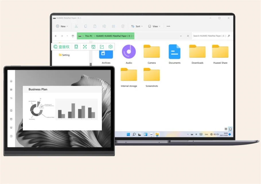 Drag files from MateBook to HUAWEI MatePad Paper in Extend Mode to optimize your analysis. With the PC drive feature, you could share the files between the MatePad Paper with MateBook.*