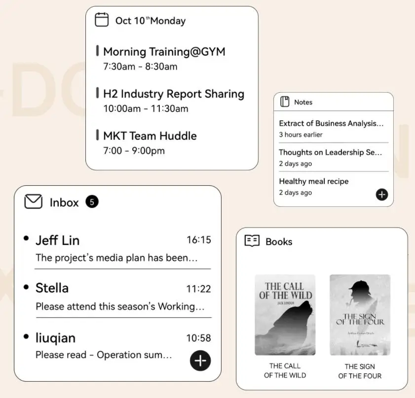 HarmonyOS 2 Service Widgets enhances quick preview of items like daily schedules, emails, calendars, and more.* Be more efficient faster.