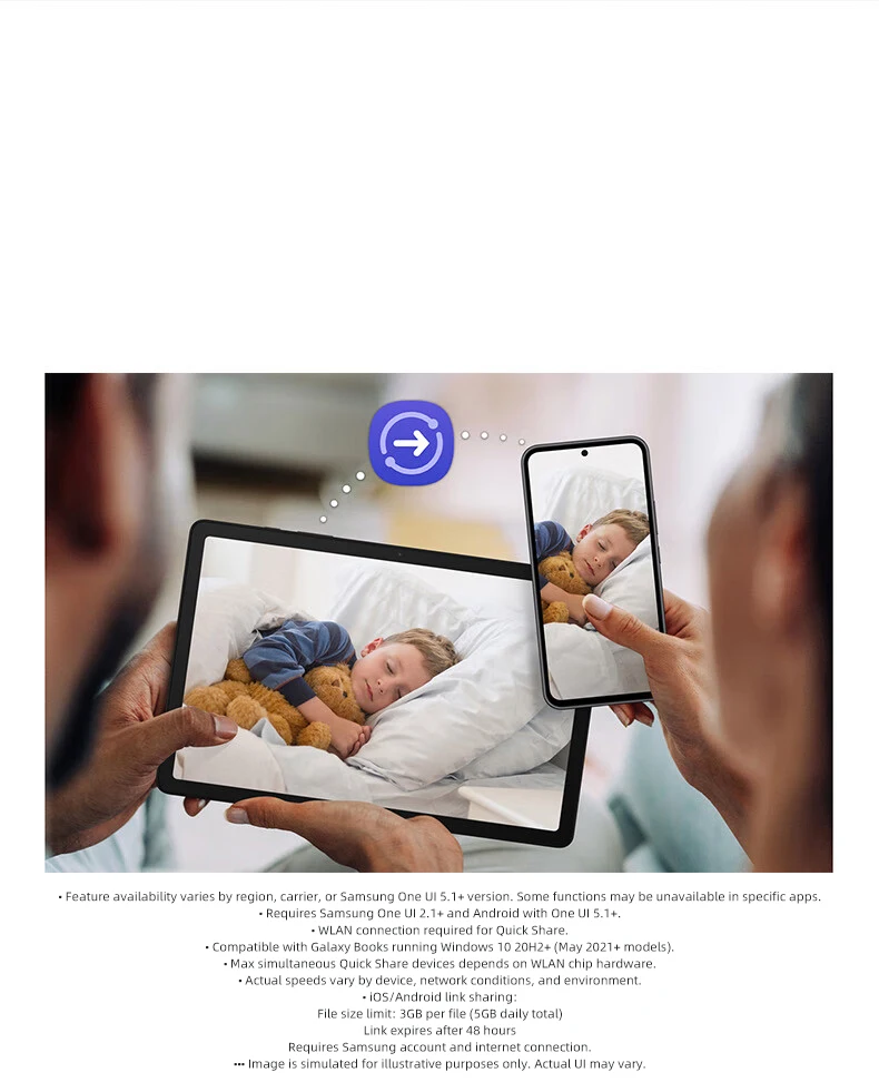 With S Quick Share, easily transfer photos, videos, and files between devices. Just select your files, tap the share button, and send them to nearby Samsung Galaxy phones or tablets—you can even share across multiple devices at once. Need to send to non-Samsung devices? It's as simple as sharing a link.