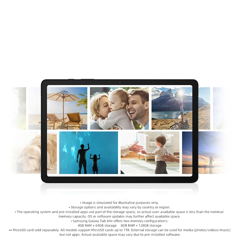 The Samsung Galaxy Tab A9+ delivers smooth multitasking with up to 8GB RAM, while its 128GB internal storage preserves your cherished HD videos, photos, and files. Expandable MicroSD support (up to 1TB) means less deleting and more keeping what you love.