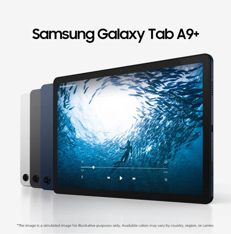 The Samsung Galaxy Tab A9+ combines sleek, minimalist design with a smooth metal finish. Available in Mountain Gray, Galactic Silver, and Ocean Blue—timeless Samsung tablet colors where each shade exudes effortless charm.