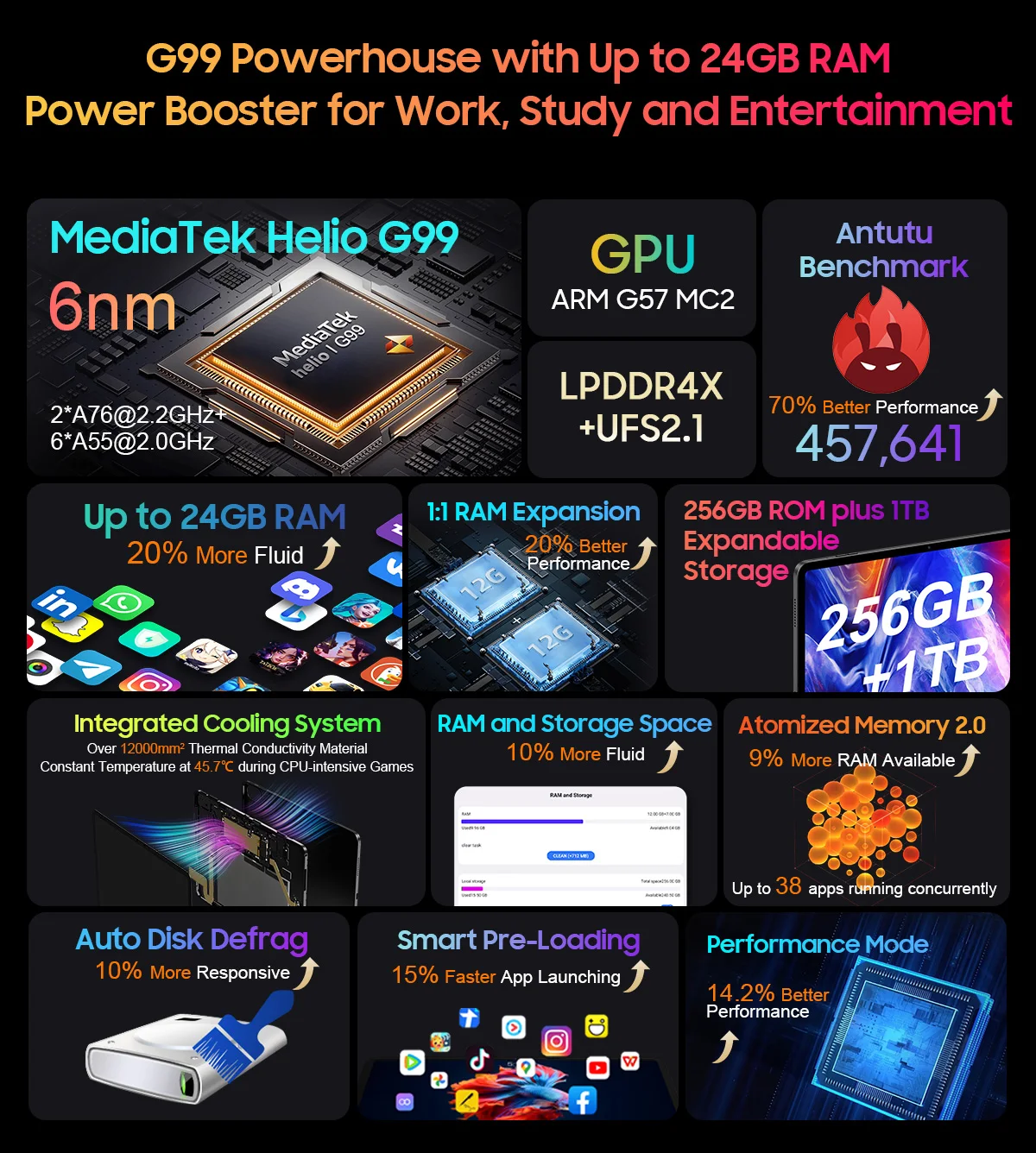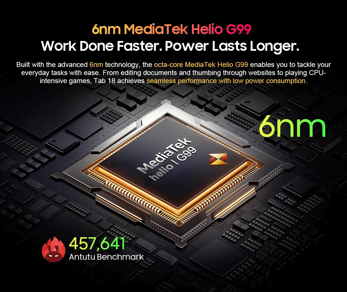 CPU : MTK Helio G99 6nm, Octa core, 2*A76 2.2GHz;6*A55 2.0GHz