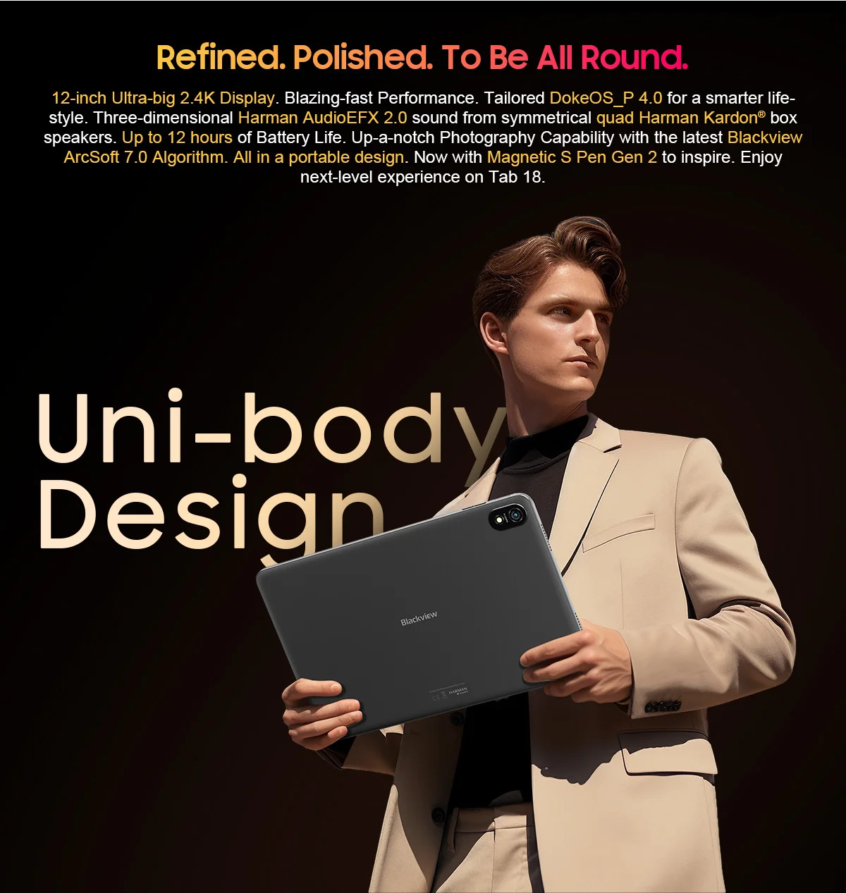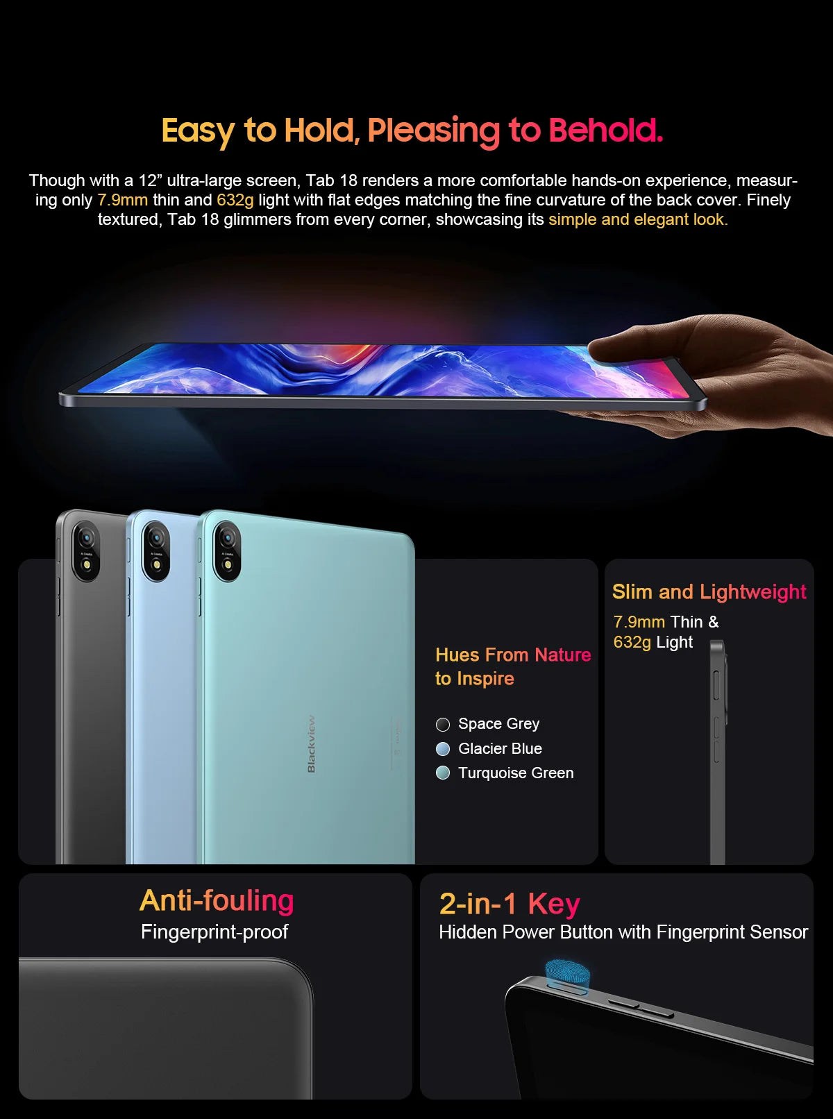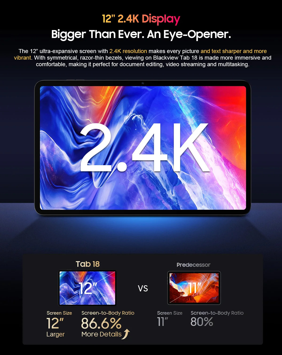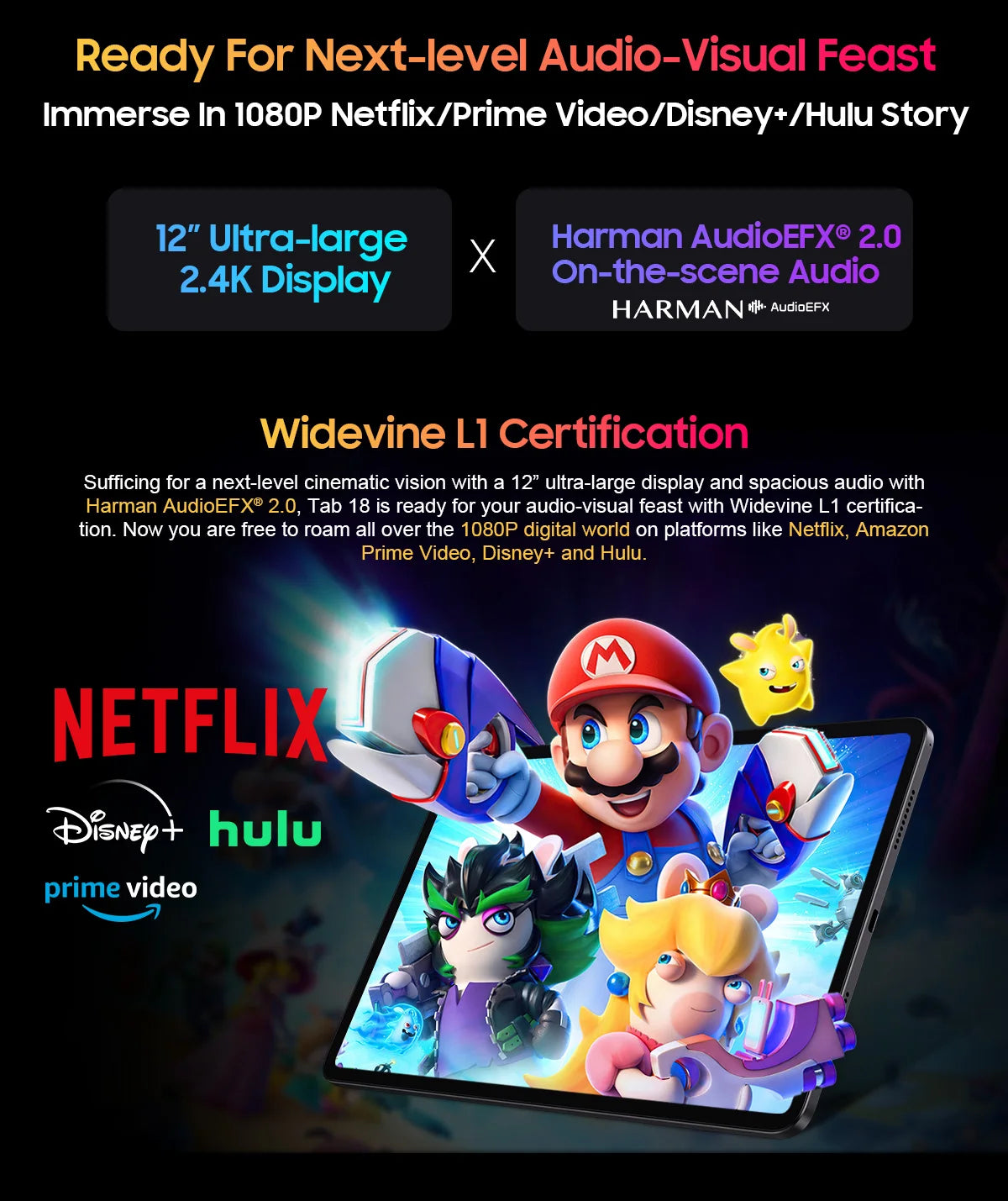 Screen : 12" FHD+ IPS 1200*2000 Display, Widevine L1 Support 1080P