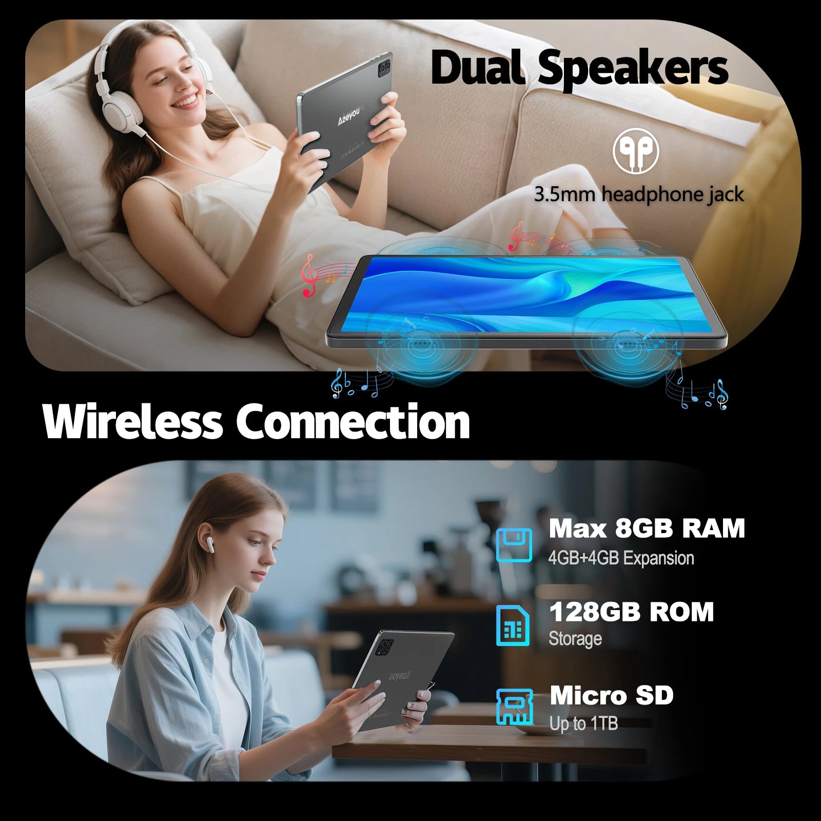 【Gaming tablet with 8GB RAM and 128GB ROM 】Equipped with 8GB RAM (4GB+4GB virtual memory)and 128GB ROM, with a maximum 1TB TF card expansion (not included), this tablet ensures fast app launches and smooth gaming experiences. Pre-installed with the Google Play Store, it allows you to easily download apps like Netflix, Facebook, Twitter, etc