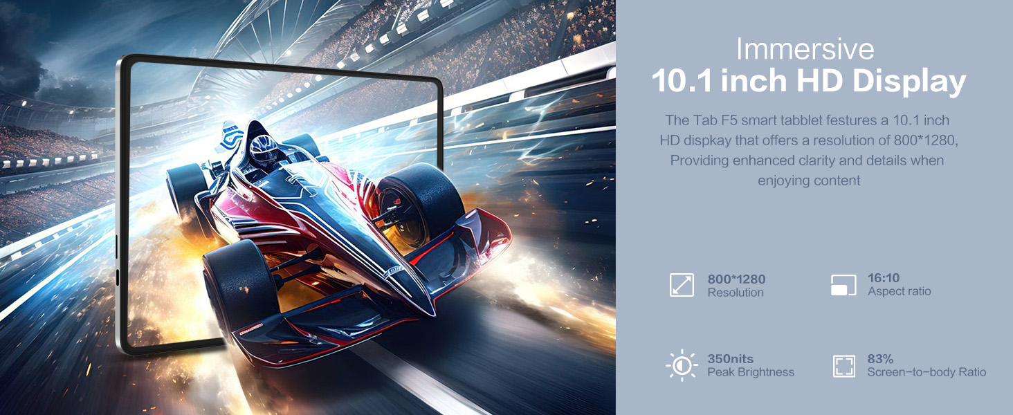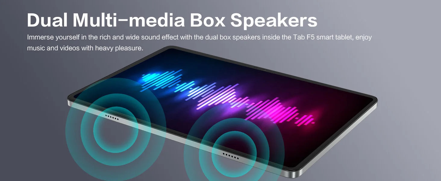 The Tab F5 smart tablet is equipped with dual multi - media box speakers. Dive into rich, expansive soundscapes and enjoy music and videos to the fullest.