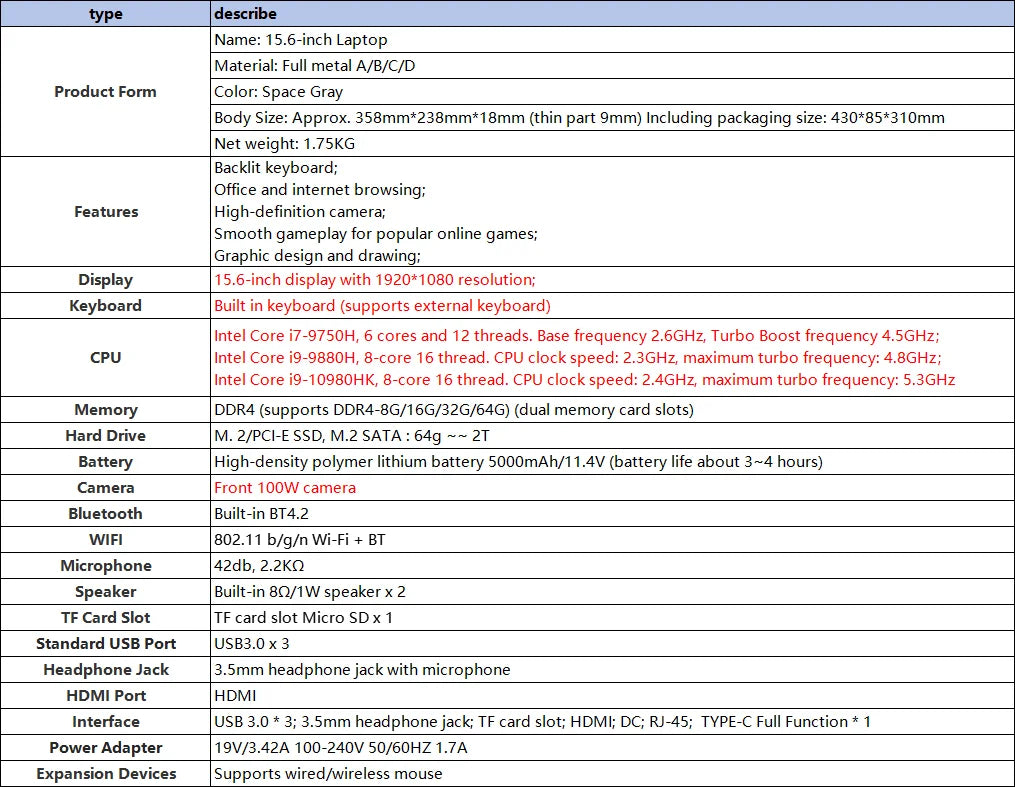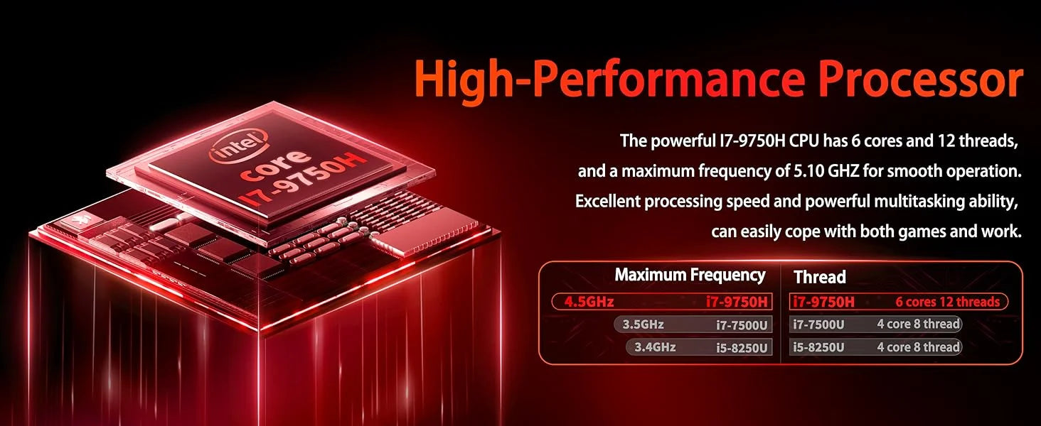 Intel Core i7-9750H, 6 cores and 12 threads. Base frequency 2.6GHz, Turbo Boost frequency 4.5GHz; |