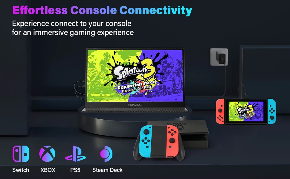 WIDE COMPATIBILITY: Visual Beat portable monitor for laptop equipped with 2 Full-featured USB Type-C ports 、1 USB 2.0 and 1 HDMI port, easy access to your favorite devices with 1 cable solution, compatible with most laptop💻, smartphone📱, PC, PS4, XBOX, or Nintendo Switch🎮, and more. It also makes it easier for you to connect peripherals such as a keyboard and mouse.