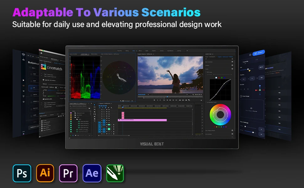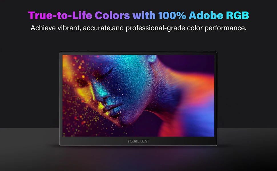 Experience unparalleled clarity and vibrant colors with the VISUAL BEAT 17.3-inch portable touch screen monitor. The UHD 4K resolution (3840x2160) IPS display offers a stunning viewing experience with ultra-sharp details, a wide color gamut of 100% AdobeRGB, and HDR support for lifelike visuals. Equipped with low blue light mode and FreeSync technology, this monitor ensures comfortable and tear-free usage during work, gaming, or entertainment.