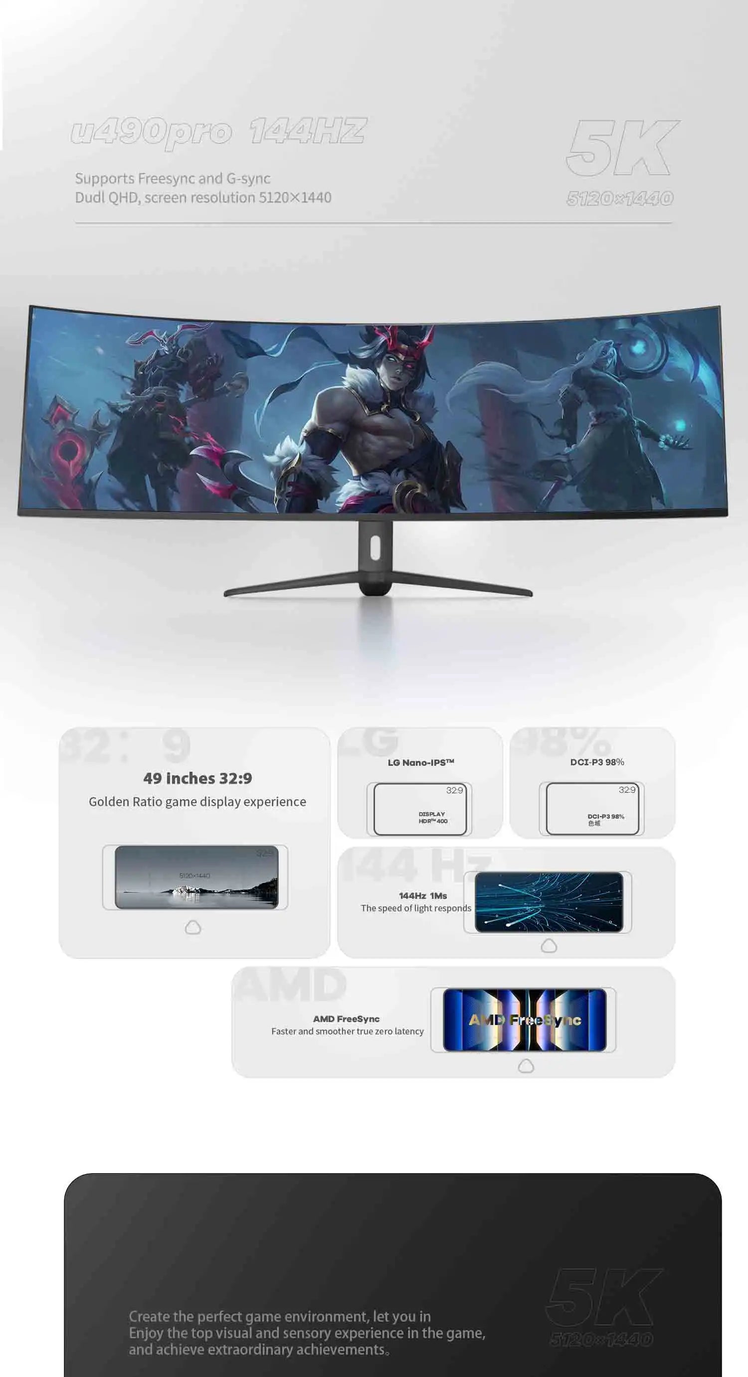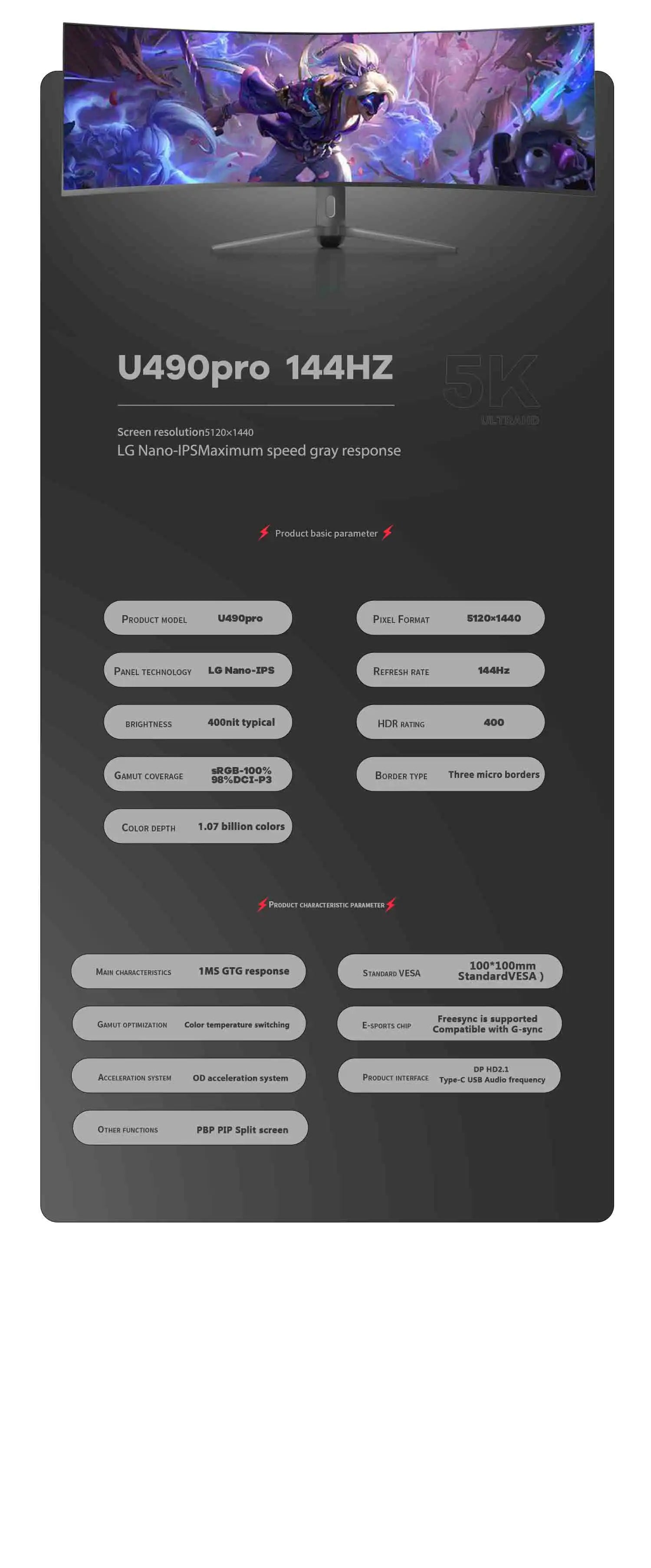 Compatible G-sync&FreeSync/Black eQualizer/ PIP&PBP/HIDPI/MPRT/Response acceleration/HDR |