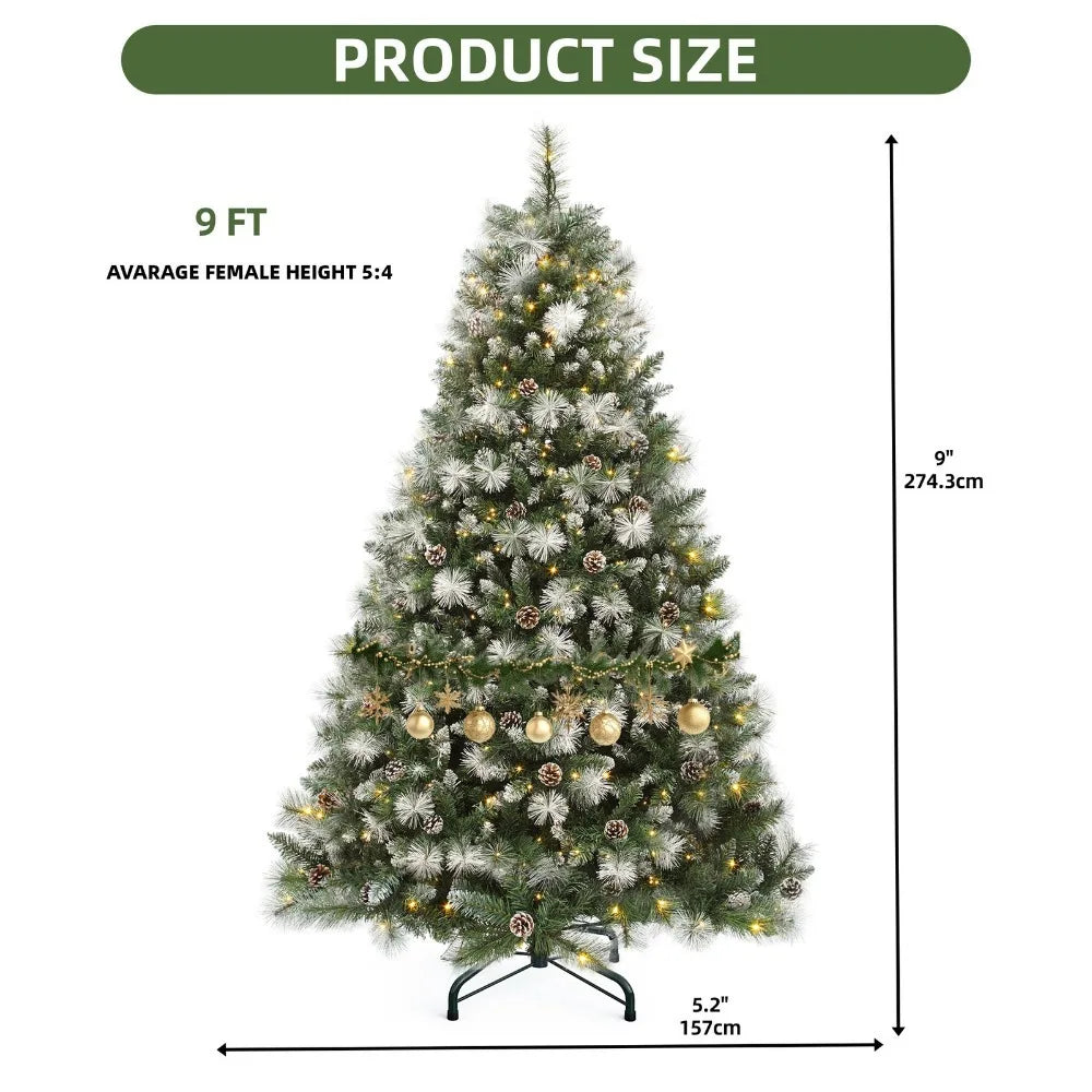 Celebrate the season with this 9ft pre-lit and pre-decorated Scotch Pine Christmas tree. Featuring 2300 PVC tips, pine cones, and realistic needles, it brings natural charm to your space. Choose from 3 light colors and 11 modes using the included remote. Hinged branches allow quick setup, and it disassembles into 4 parts for easy storage. With a sturdy X-shaped base, it's built to support ornaments and holiday joy year after year.