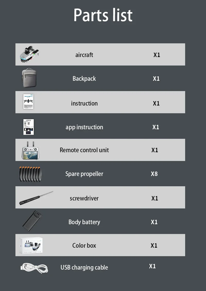 Accessories list: Aircraft * 1, remote control with screen * 1, body battery * 1, fan blades * 8, USB cable * 1, screwdriver * 1, instruction manual * 2, color box * 1, backpack * 1 (can be purchased separately: obstacle avoidance device)