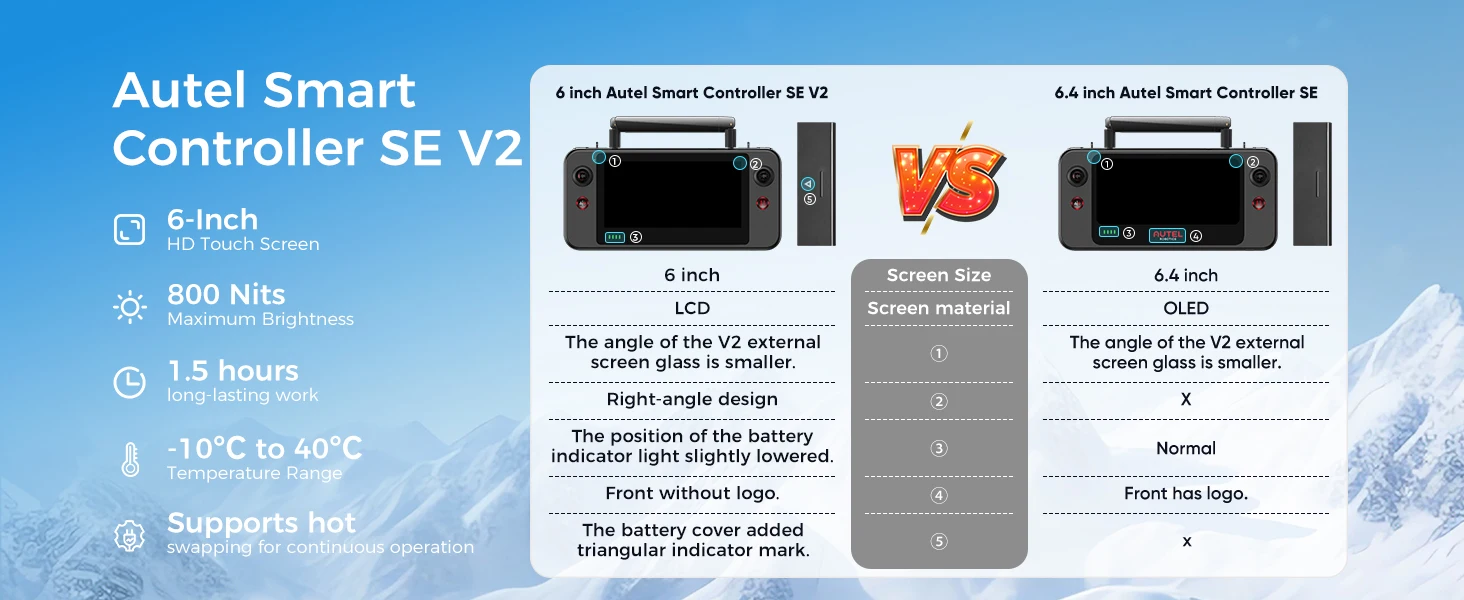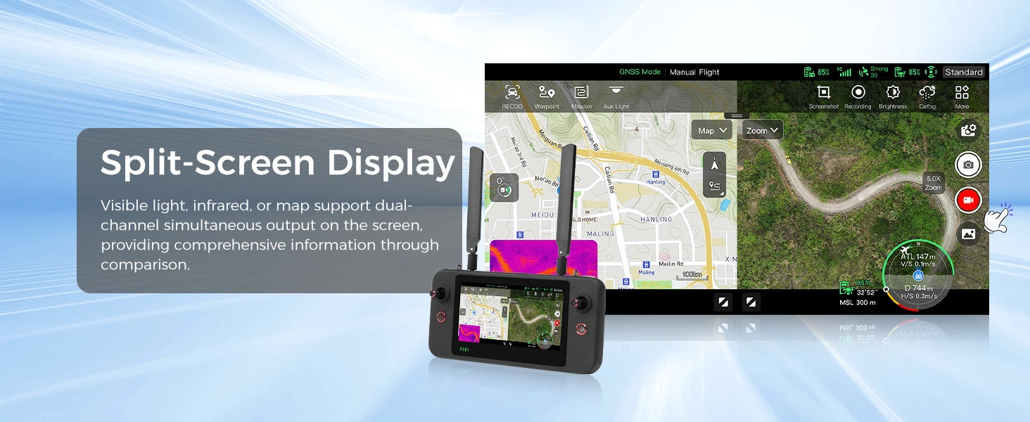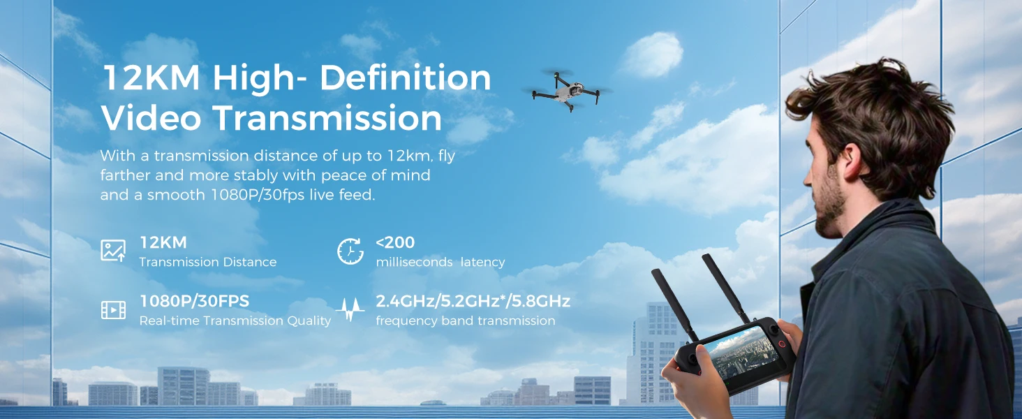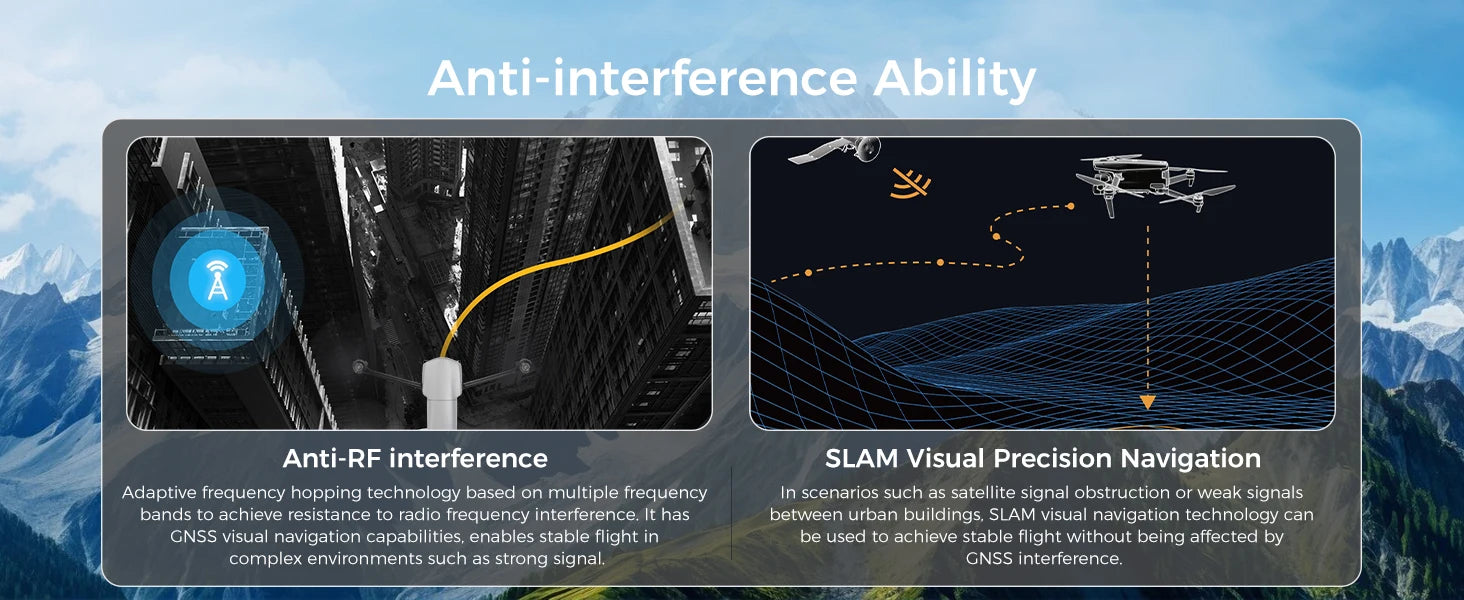 Equipped with Autel SkyLink image transmission technology for a dual-signal, dual-reception system, the image transmission anti-interference capability improved, and the transmission distance reaches up to 12 kilometers. It supports 2.4GHz/5.2GHz/5.8GHz adaptive frequency hopping transmission, automatically selecting the best channel based on electromagnetic interference, providing strong anti-interference capability.