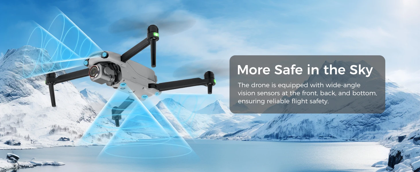 The drone is equipped with wide-angle vision sensors at the front, back, and bottom, ensuring reliable flight safety.