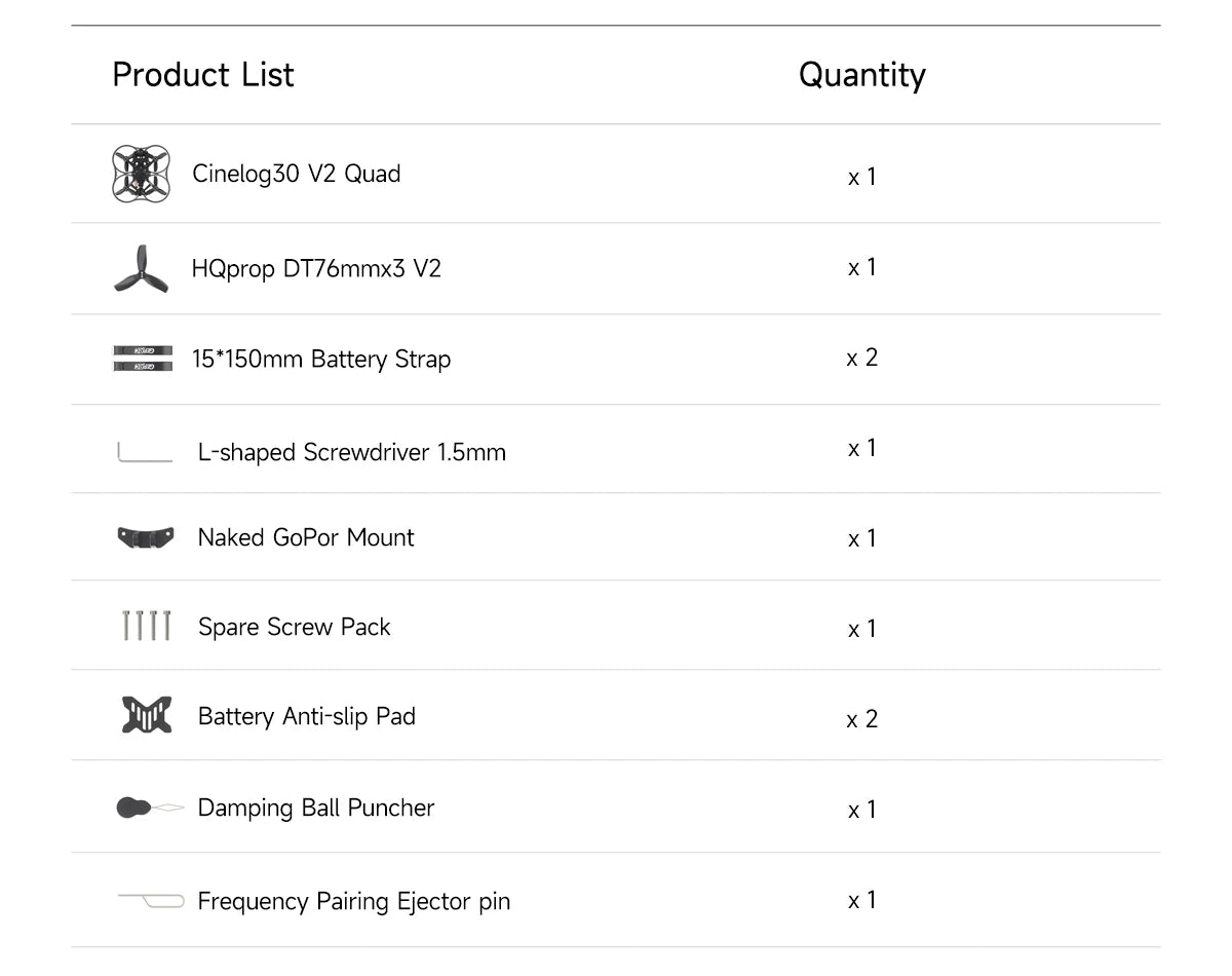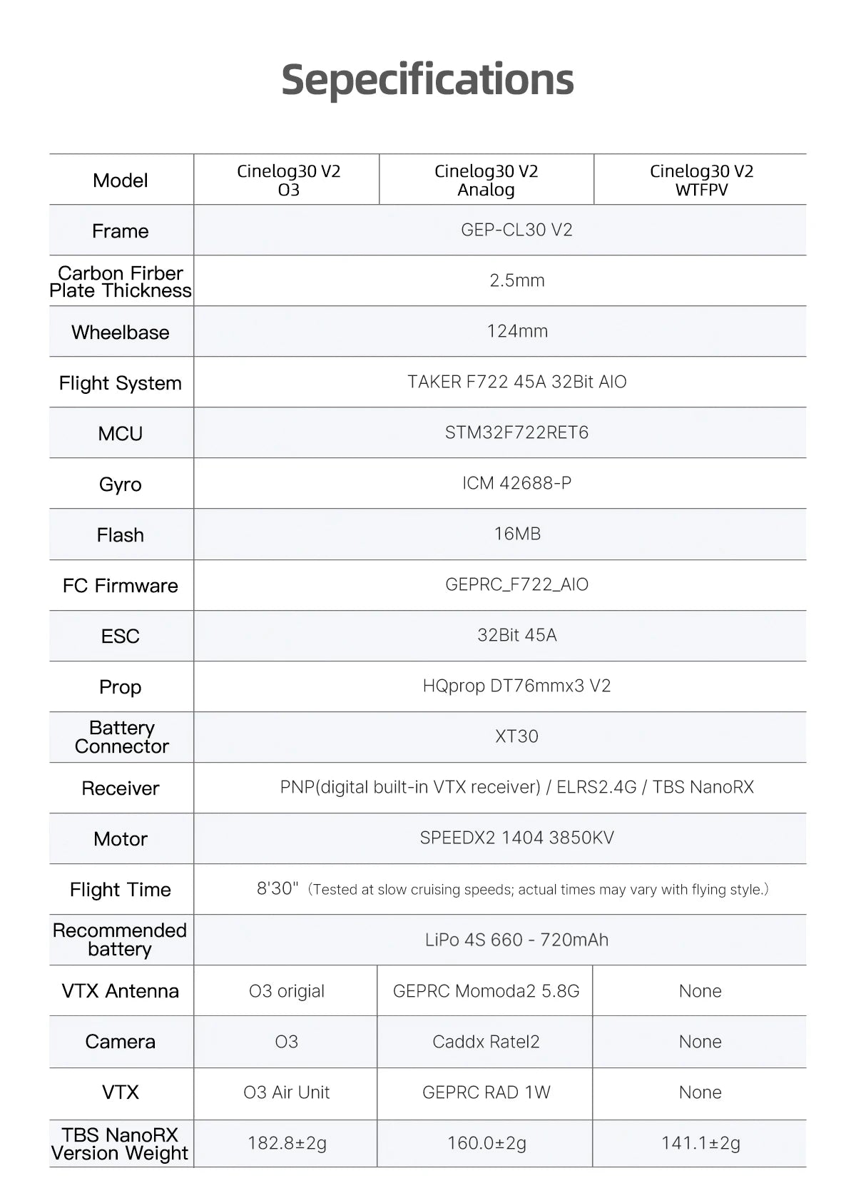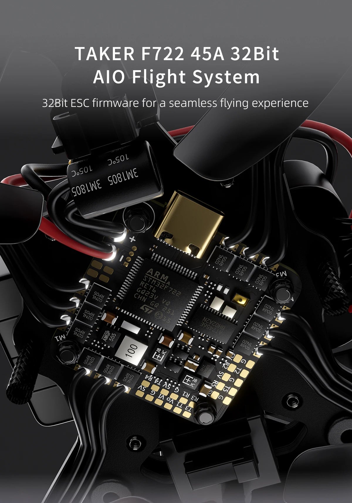 Powered by the TAKER F722 45A 32Bit AIO flight controller, 1404 3850KV motors, and HQprop DT76mm propellers, the Cinelog30 V2 offers up to 8'30'' of flight time with a LiHV 4S 720mAh battery. Compatible with Naked GoPro, Action2, and Insta360 cameras, it provides versatile shooting options.