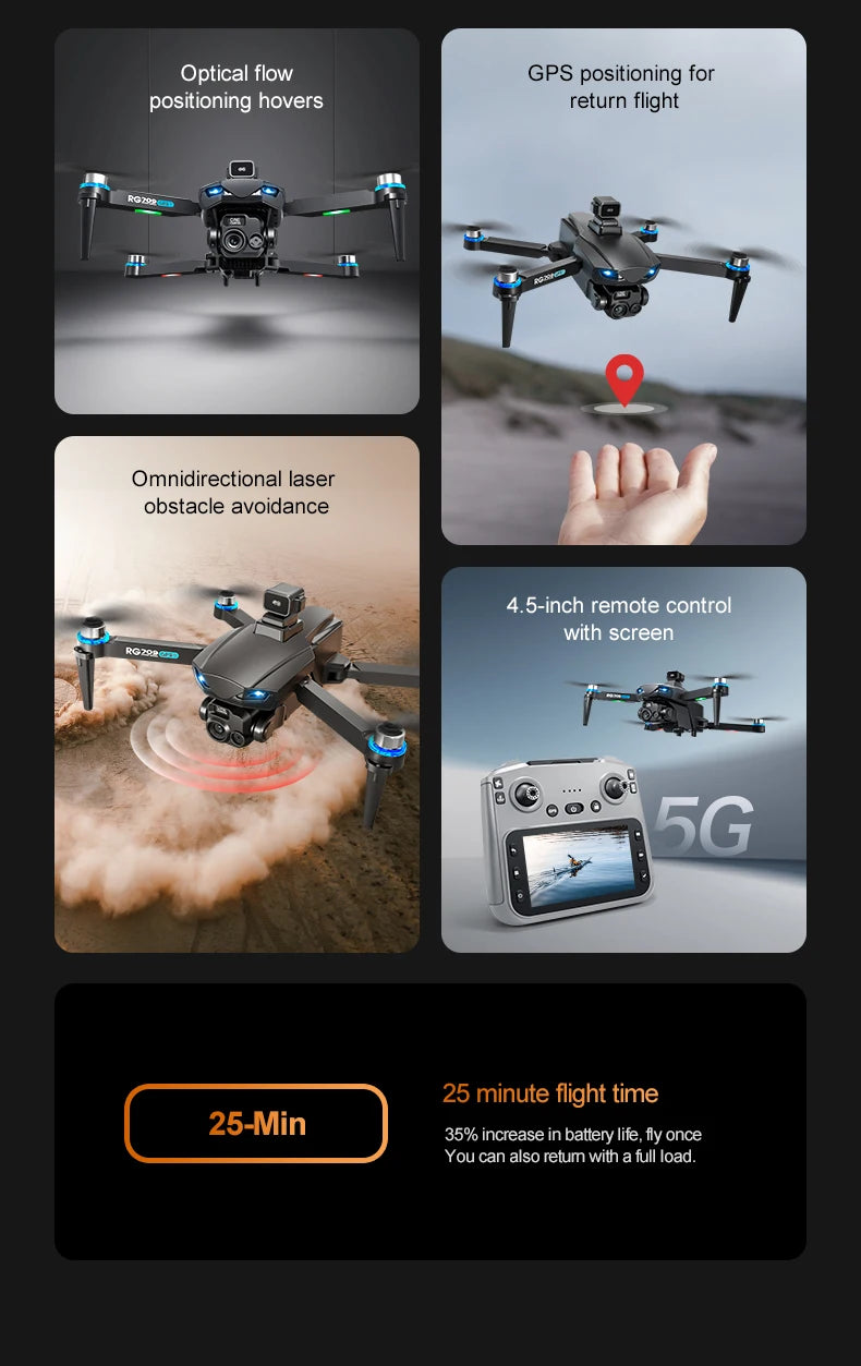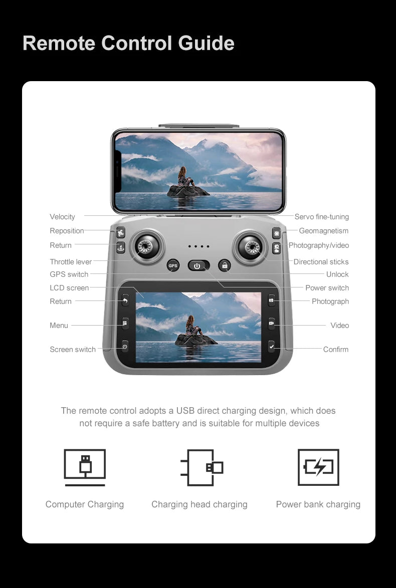 Remote control with 4.5-inch display screen, infrared obstacle avoidance/laser obstacle avoidance (optional) brushless powerful motor, GPS automatic return, optical flow positioning, electrically adjustable camera,