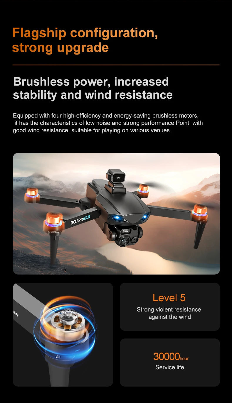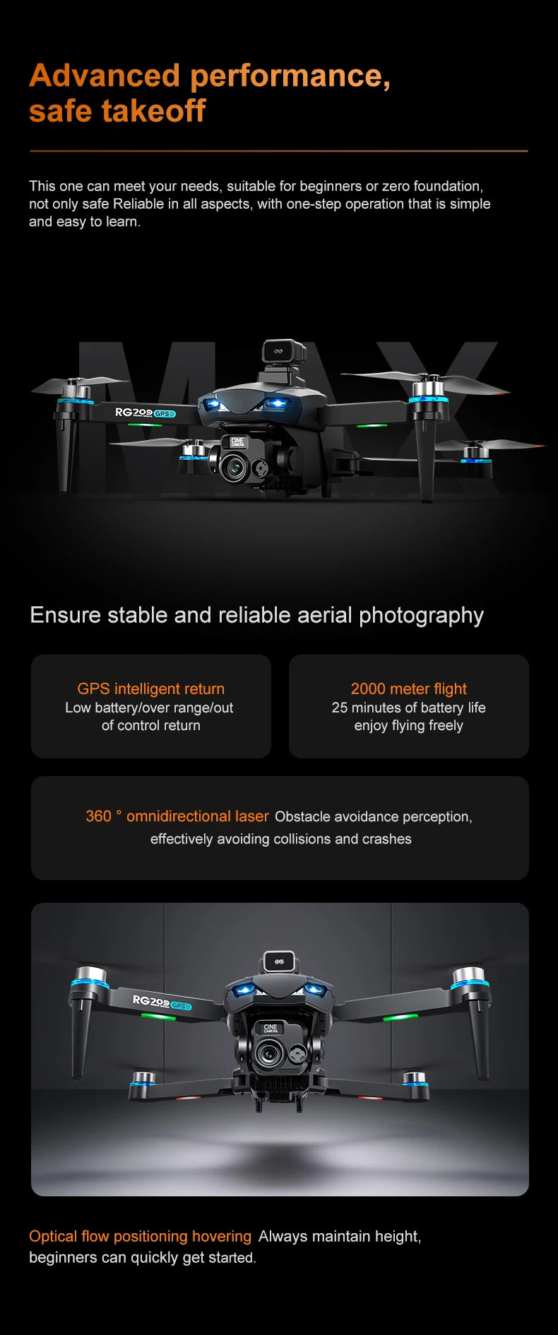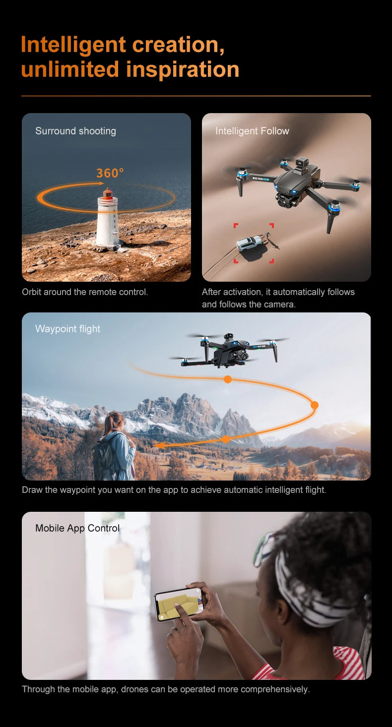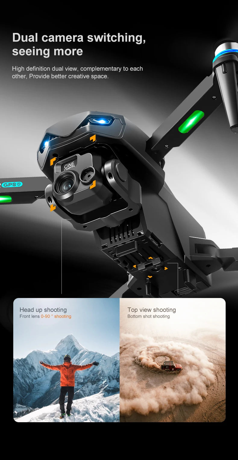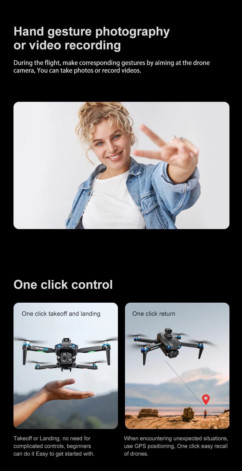 Equipped with camera function, brushless powerful motor, GPS automatic return, optical flow positioning, electrically adjustable camera, six way gyroscope; Up and down, forward and backward, left and right side flight, steering, headless mode, body light, gesture photography, video recording, headless mode, emergency stop, trajectory flight, gravity sensing, music, 50x zoom, automatic photography