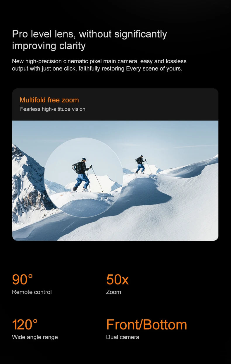 ① The front lens is equipped with high-definition WIFI, and the bottom high-definition lens has optical flow that can switch the shooting angle. The servo gimbal is designed to increase stability, making the photos clearer when taken;
